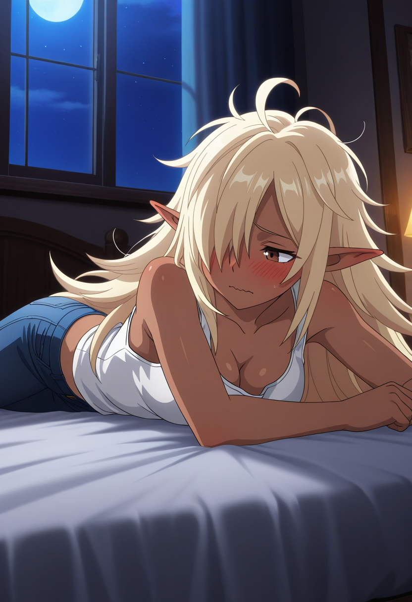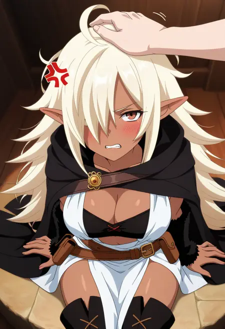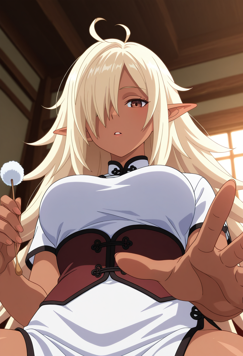 - elizaww, 검은 피부의 여성, 다크 엘프, 뾰족한 귀, 갈색 눈, 밝은 금발, 매우 긴 머리, 어지러운 머리, 한쪽 눈 위의 머리카락, 아호게, 중간 크기의 가슴