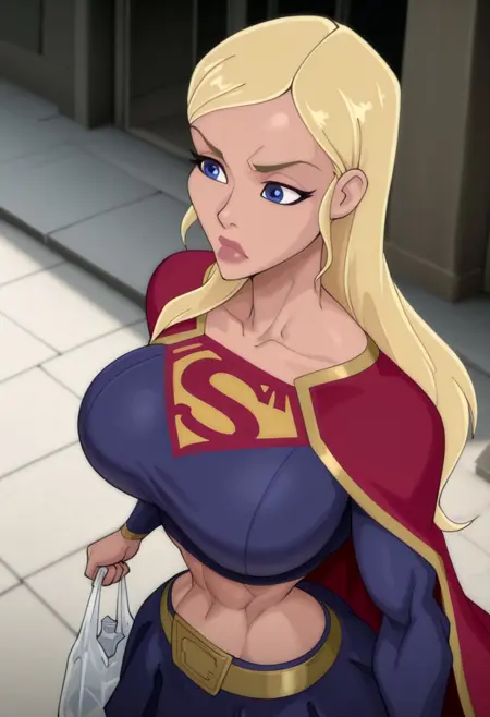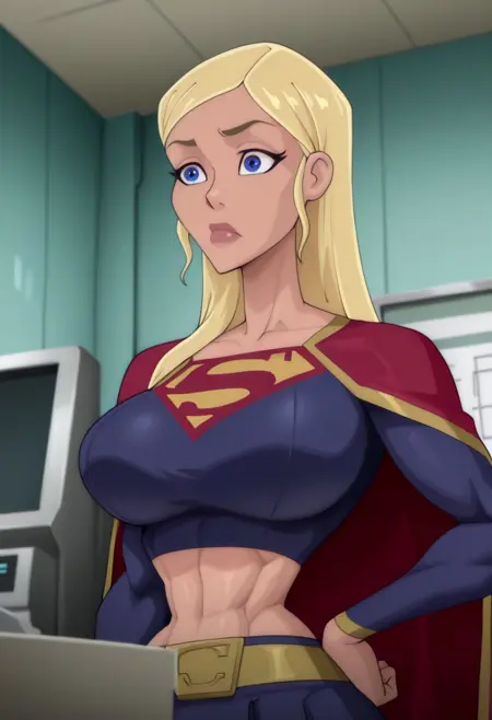blue croptop, midriff, red cape, gold trim, chest logo, blue skirt, gold belt, short skirt,