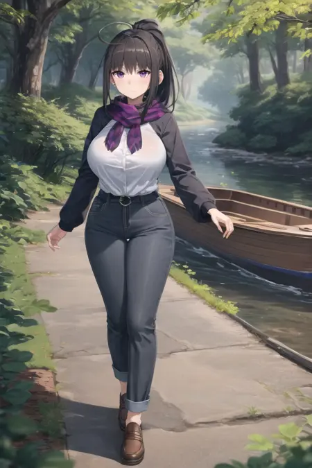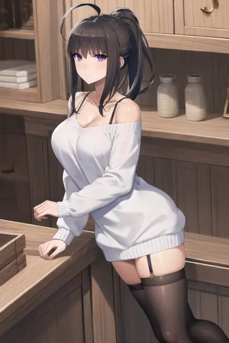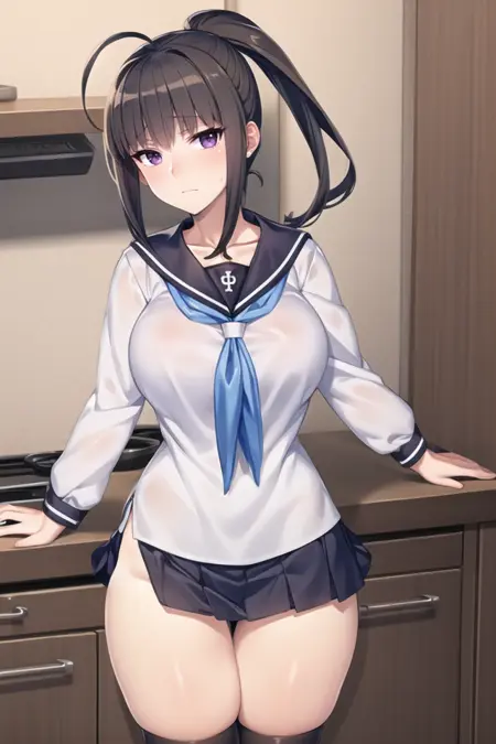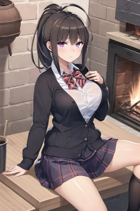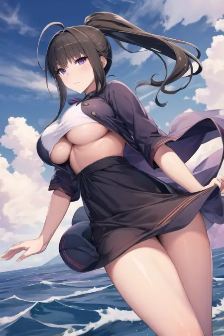 可能有帮助的额外词汇:紫色眼睛、呆毛、马尾辫、深棕色头发、大胸部