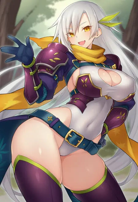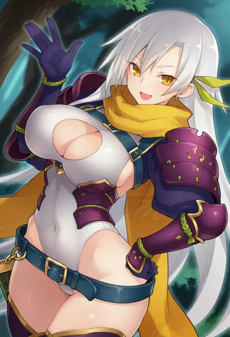 hair ornament, white leotard, cleavage cutout, yellow scarf, belt, shoulder armor, purple armor, purple thighhigh, gloves