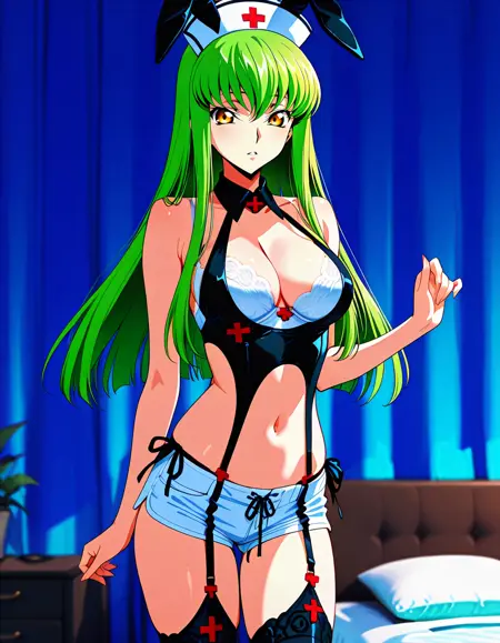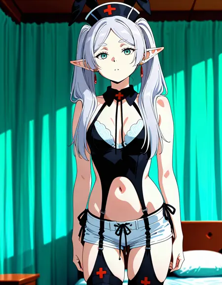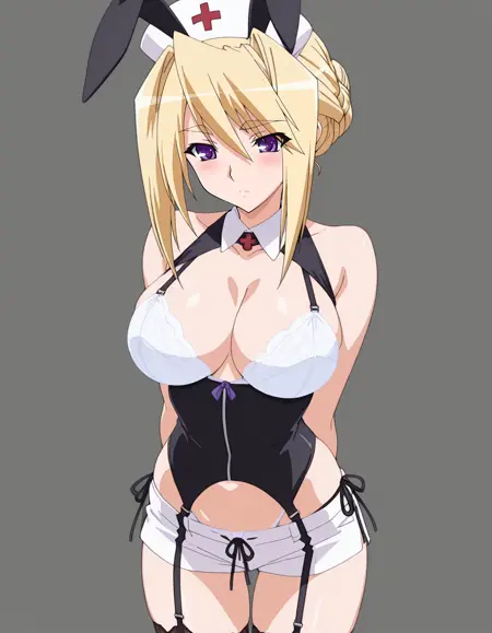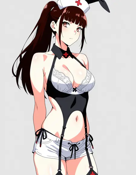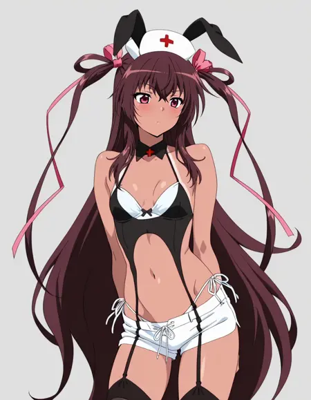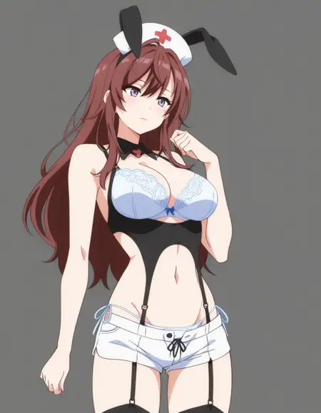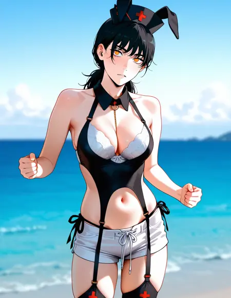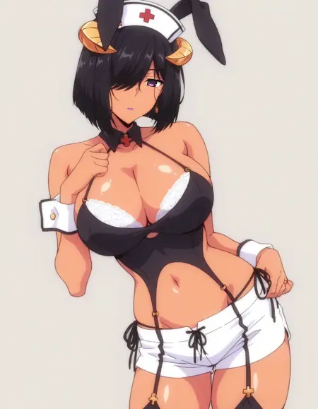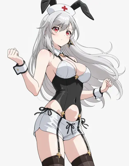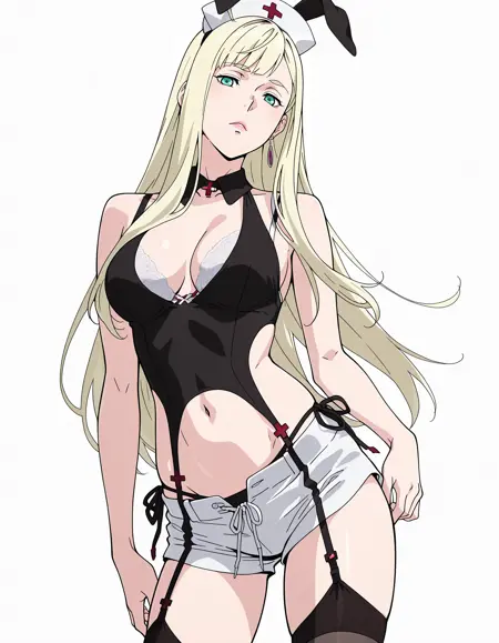 mai_bjanld,white_bra,black_leotard,white_shorts,garter_straps,thighhighs,nurse_cap,fake_rabbit_ears,side-tie_panties,bra_peek,navel