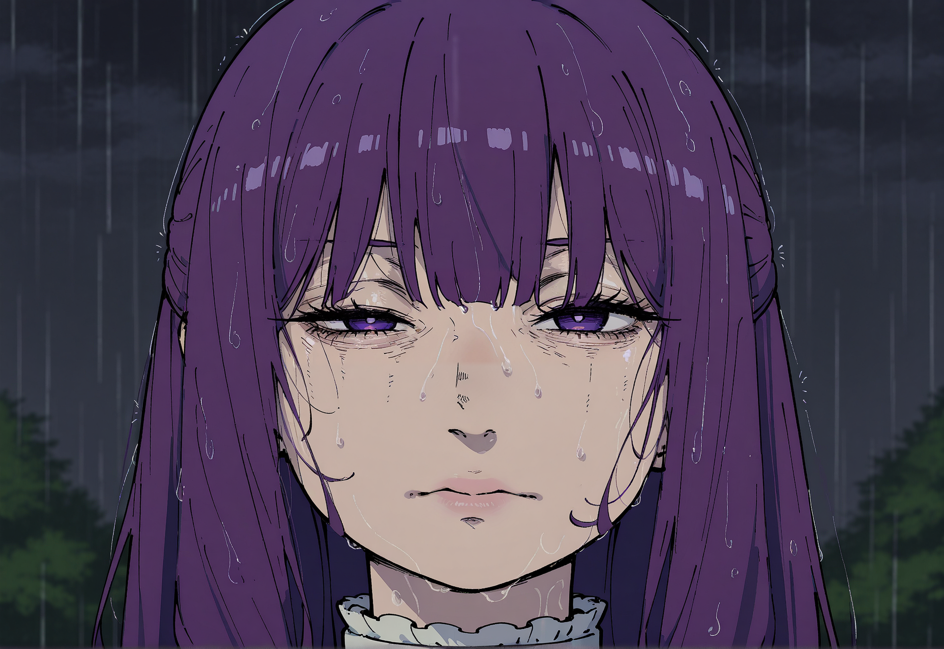 • 湿っている、濡れた髪、悲しい、水平の瞳、半閉じた目、無表情、摩耗、しわ、