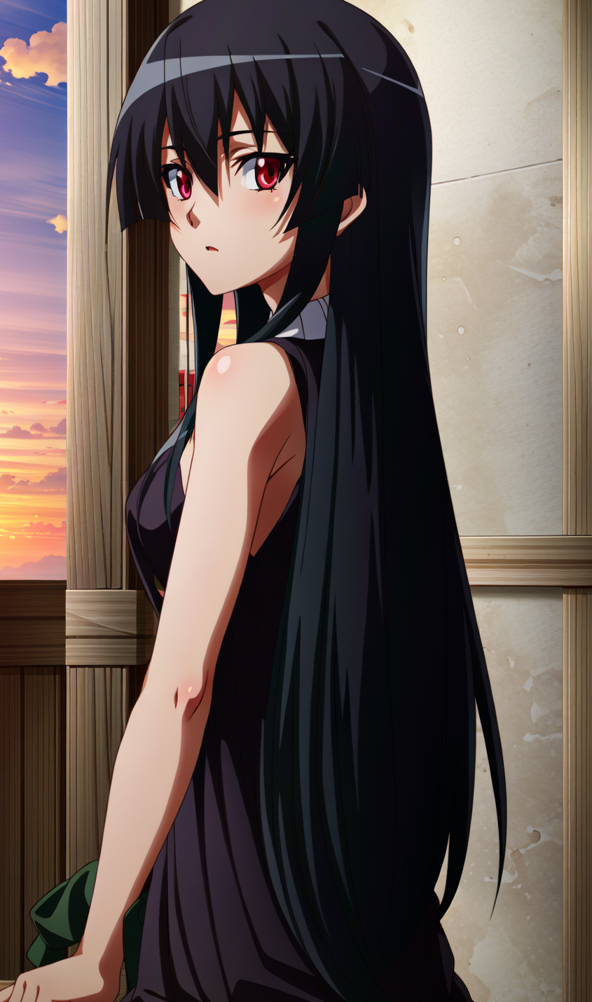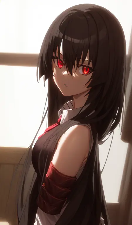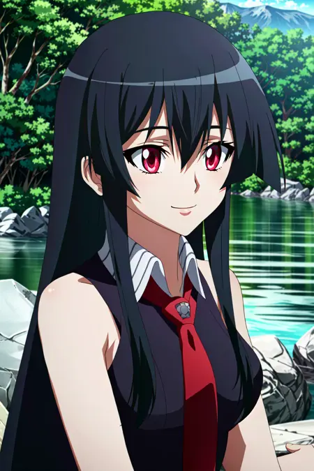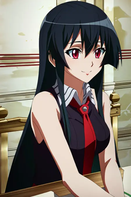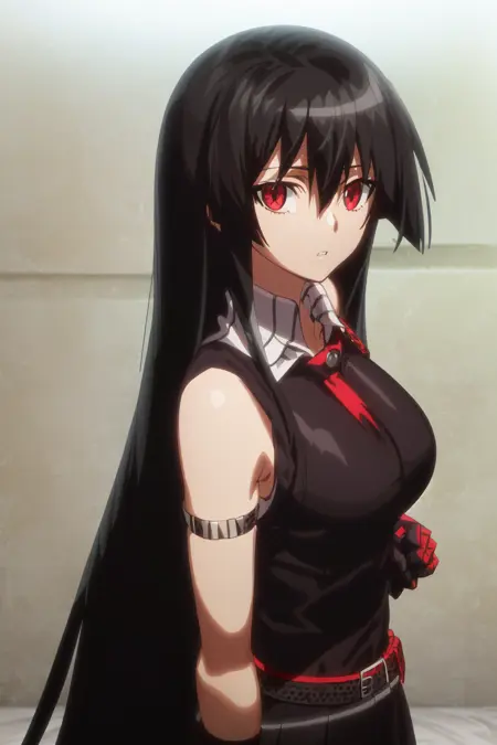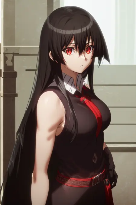 Akame, 1girl, solo, long hair, red eyes, black hair, necktie, bare shoulders, belt, sleeveless, skirt