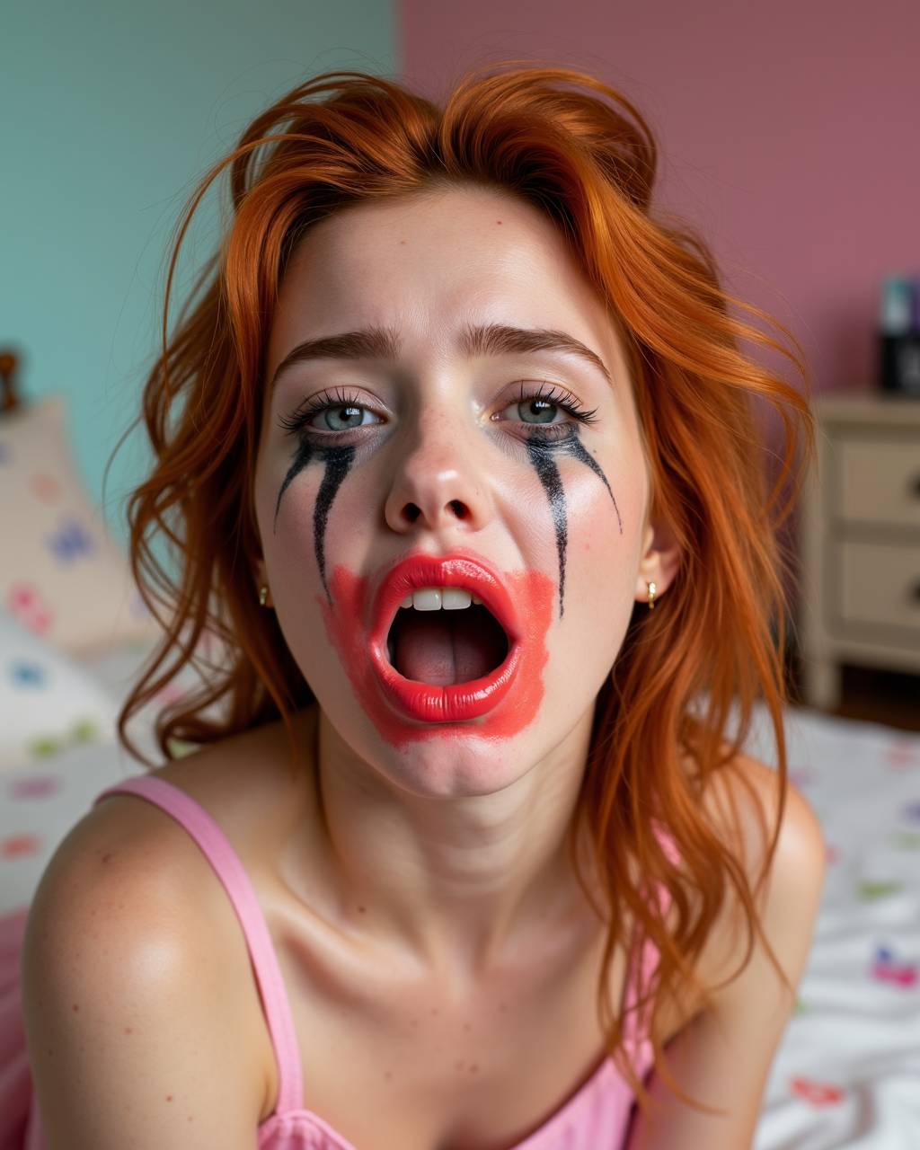 d3stroyed, 20歳のスリムな赤毛の女性、明るい赤いリップが唇にぼやけて不均一な線で滲み、頬やあごに粗く拭き取られたようにべっとりと広がっている、崩れたメイクルック