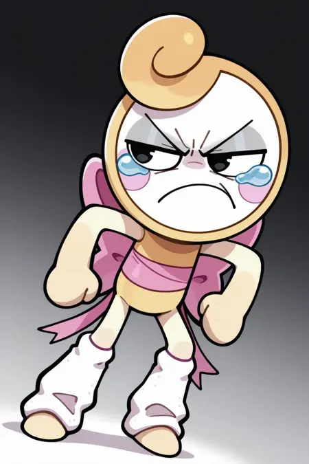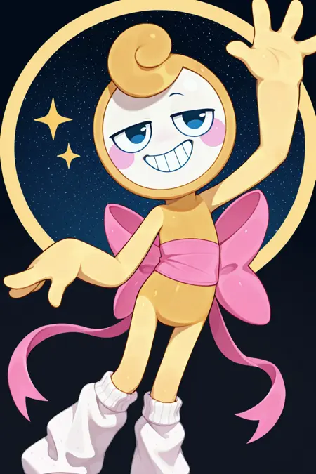 유용한 태그: glistendw, 노란 피부, 하얀 얼굴, 삐뚤게 웃는 표정, 뺨에 빨간 스티커, 검은 반달 모양 눈, 뒤로 묶인 허리 리본, 흰색 다리 워머, 간단한 손가락 없는 손