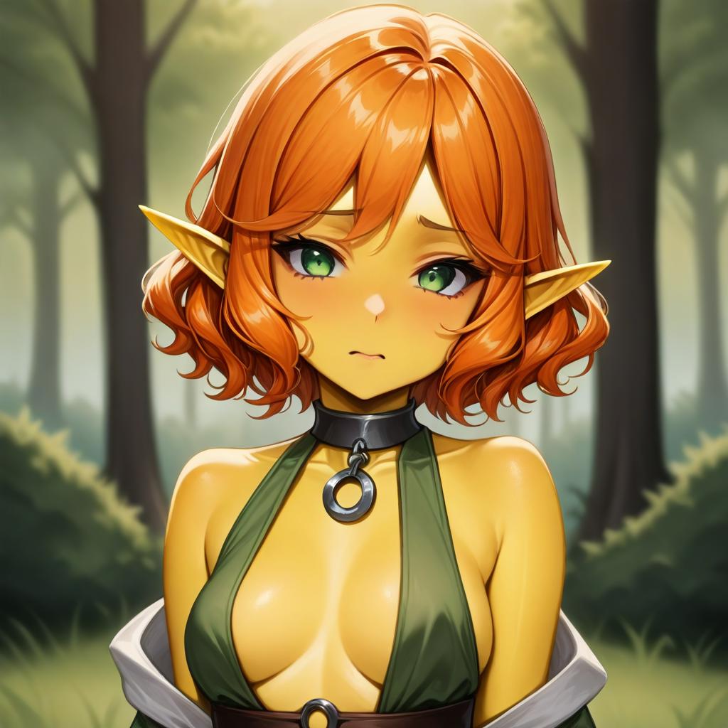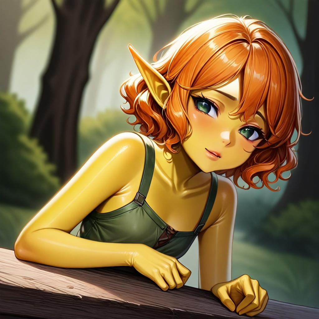 1girl, solo, 0rpheli4, yellow skin, elf ears, short hair, orange hair, wavy hair, green eyes,
