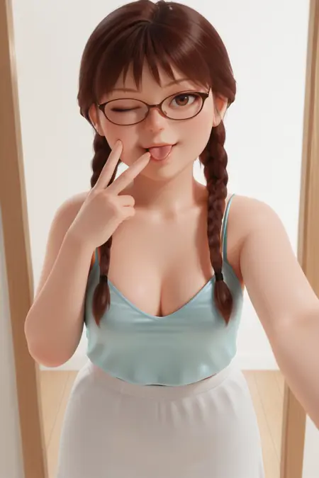 vic_oc, brown hair. long hair, brown eyes, glasses, twin braids, camisole, skirt