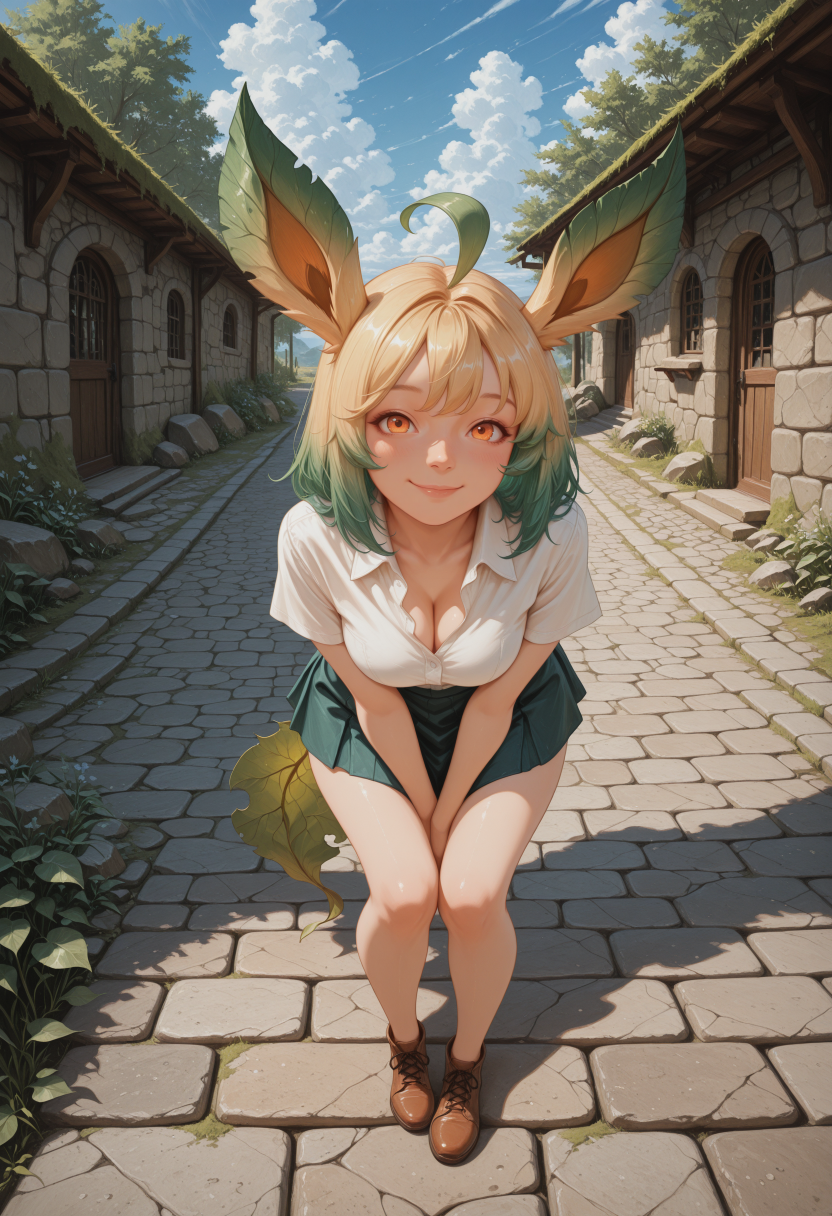 (긍정적 프롬프트) lynleaf, 인격화, 몬스터 소녀, 동물 귀, 잎 꼬리, 꼬리, 주황색 눈, 그라데이션 머리카락, 금발 머리카락, 녹색 머리카락, ahoge,