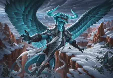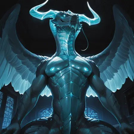 태그: 드래곤, 곡선 뿔, 연한 파란 비늘, 반인반수, 인간 없음, 깃털 날개, 꼬리, 가느다란 수염, 빛나는 눈
