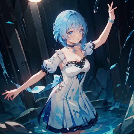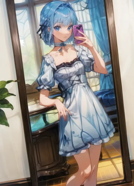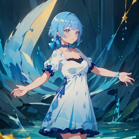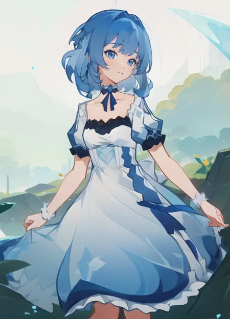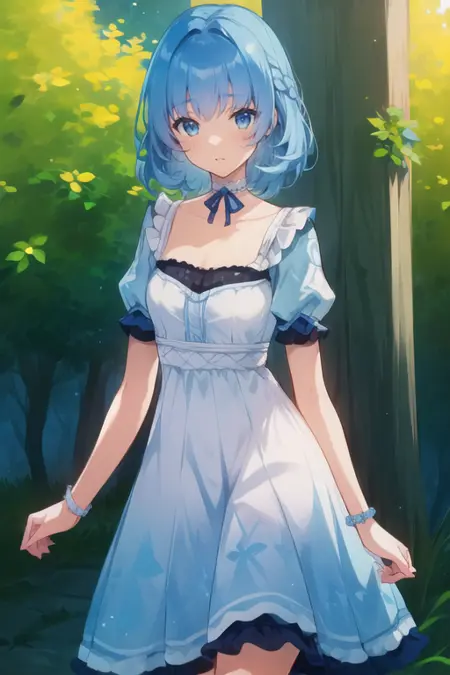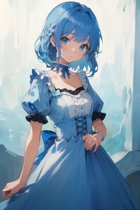 masterpiece, best quality),(depth) of (field), lora:Mary-Ann:0.8 1girl, white and blue dress, blue hair, medium length hair, frills, bangs, choker, blue eyes, lora:st-fs\_v1.1:-1, portrait, adult