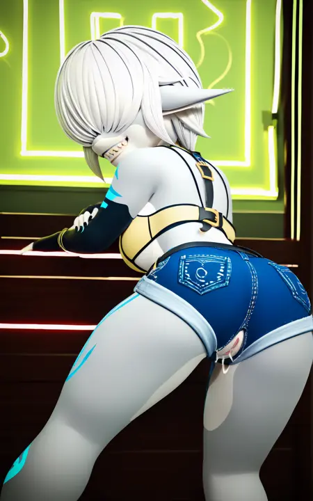**Reinforcement Tags: **barefoot, arm tattoo, tattoo, body markings, pointy ears, colored skin, grey skin, short hair, white hair, hair over eyes, covered eyes