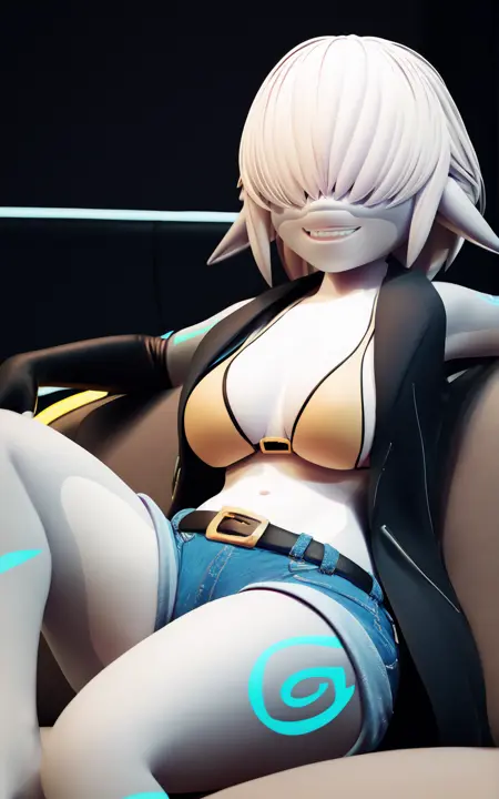 **For her Outfit: shorts, blue shorts, denim shorts, denim, black belt, belt, belt buckle, leg tattoo, coat, black coat, sleeveless, bikini, yellow bikini, bikini top only, open clothes, gloves, fingerless gloves, elbow gloves, black gloves