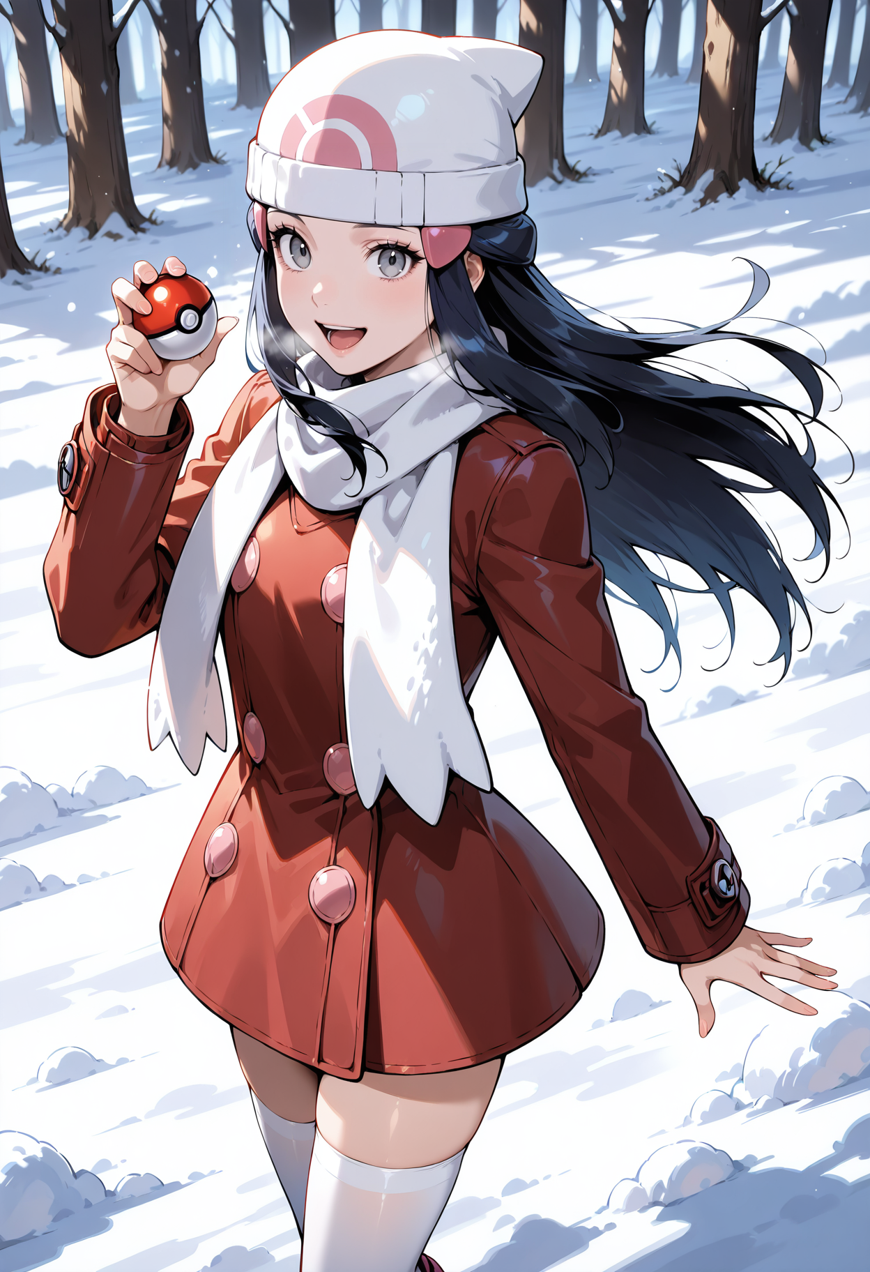 帽子、ビーニー、白いスカーフ、膝上長靴、ピンクの靴、ブーツ、白い頭部装飾、太もも上長靴、スカーフ、時計、コート、髪飾り、リストウォッチ、長袖、髪留め、白い太もも上長靴、赤いコート、ボタン、冬服、ポケモンボール柄