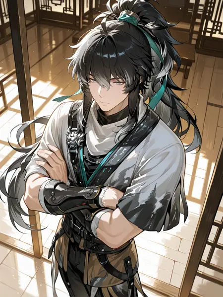 Qiuyuan, qiuyuan (wuthering waves), 黑发, 长发, 灰色眼睛, 马尾, 发带, 侧发