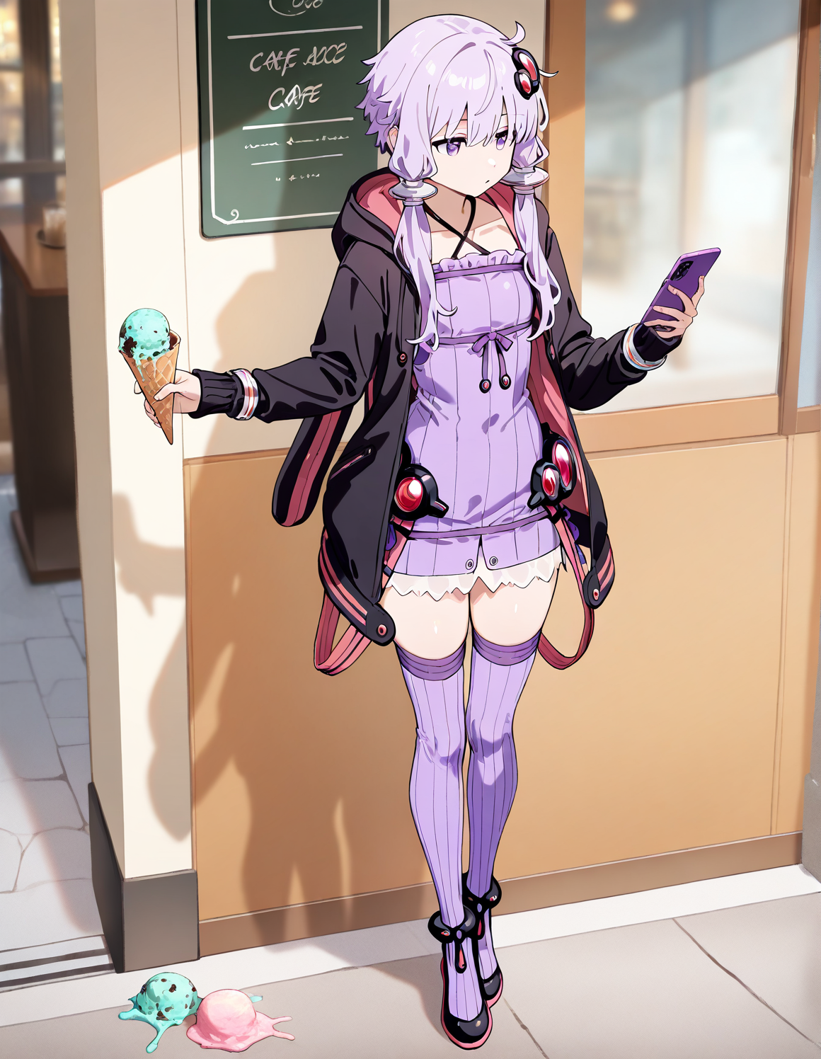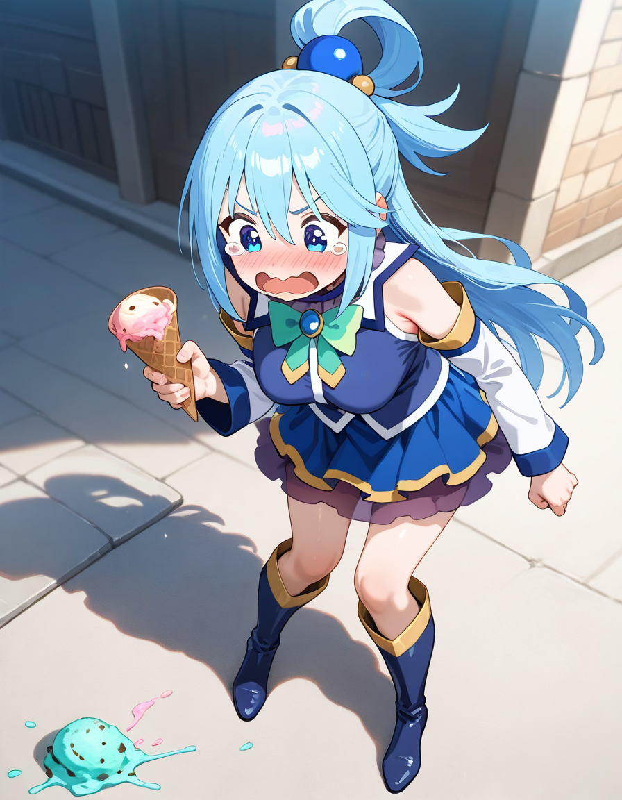 [Concept] Ice cream cone spill (ice cream cone held + ice cream dropped on ground) | アイスクリームをこぼす (手にコーン + アイスを地面に落とす) | Illustrious v.0.1