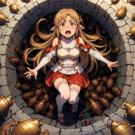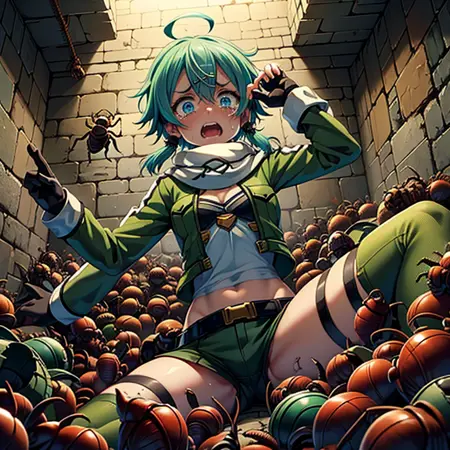 벌레 떼로 가득 찬 함정 바닥에서 절망에 빠진 장면.