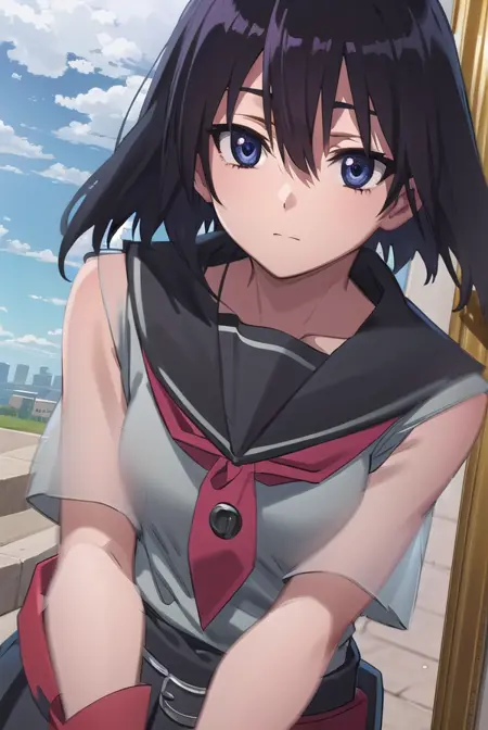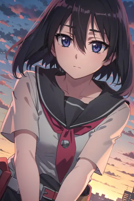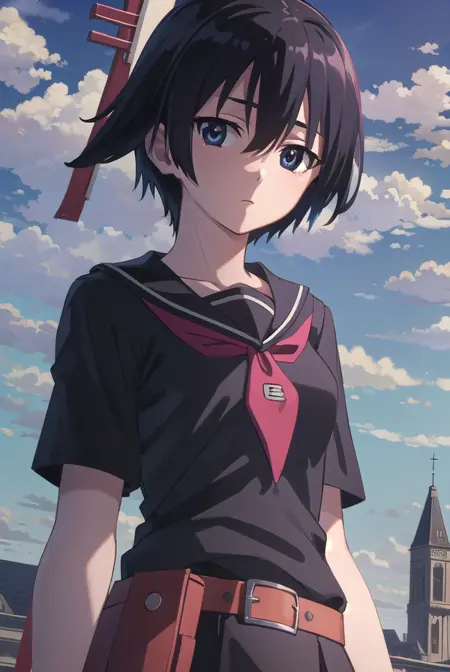 スカート、学園制服、serafuku、ベルト、黒いserafuku、短袖、ベルト、黒いスカート、ネッカチフ、赤いネッカチフ、