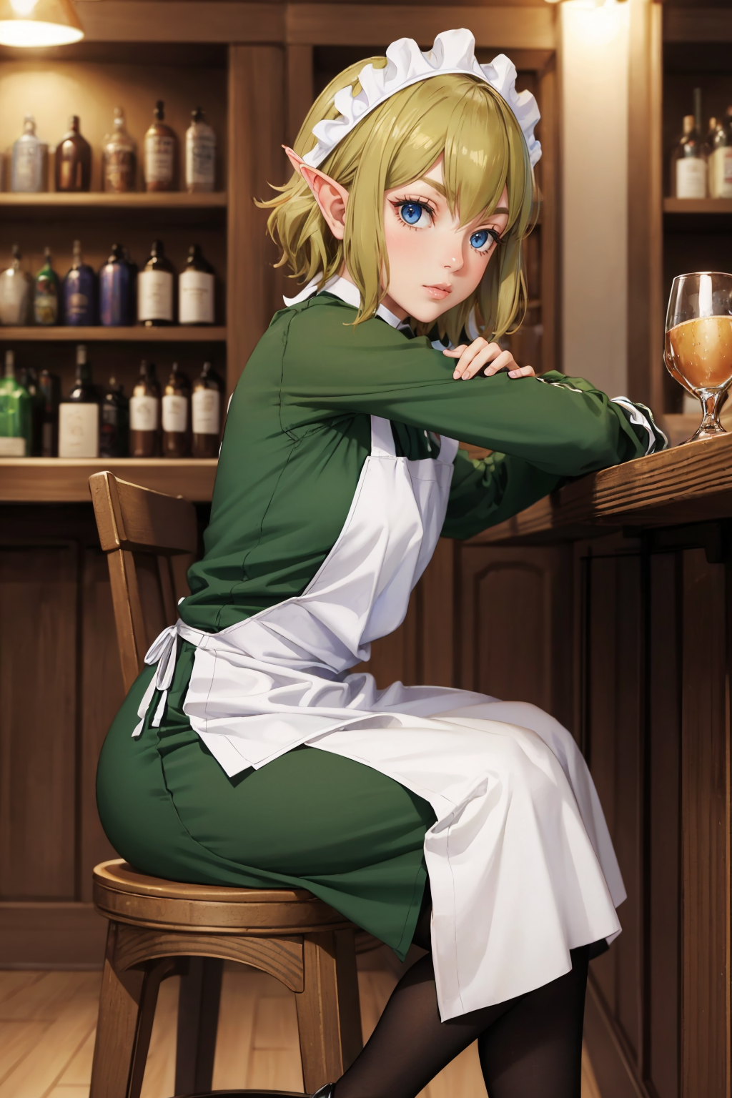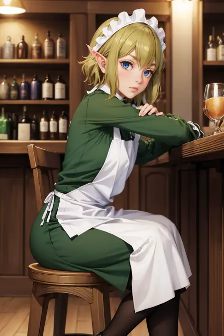 为她的女仆装束添加:“女仆头饰、绿色连衣裙、长袖、白色围裙、连裤袜”。