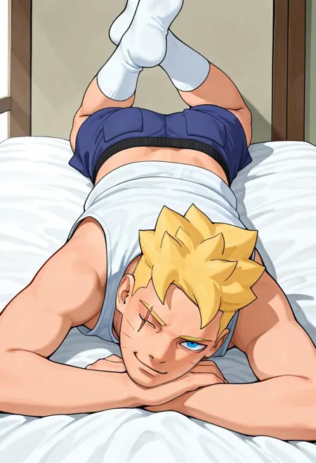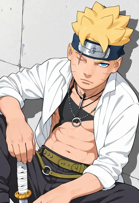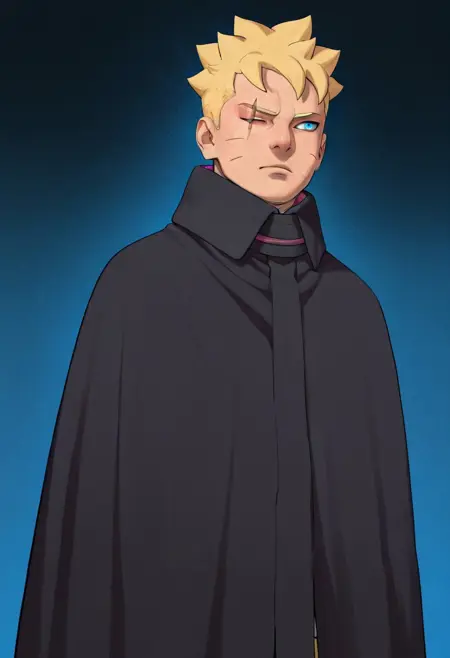 | 训练词汇 | Boruto, Blonde Hair, Blue Eye, One Eye Closed, Scar on Eye, Whisker Markings已复制! Black Jacket, White Shirt, Partially Open Shirt, Necklace, Glove On One Hand, Two Belts, Black Pants, Black Cloak, Open Toed Footwear, Forehead Protector, Marking on Chest已复制! |