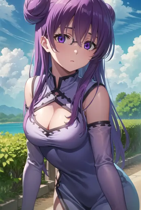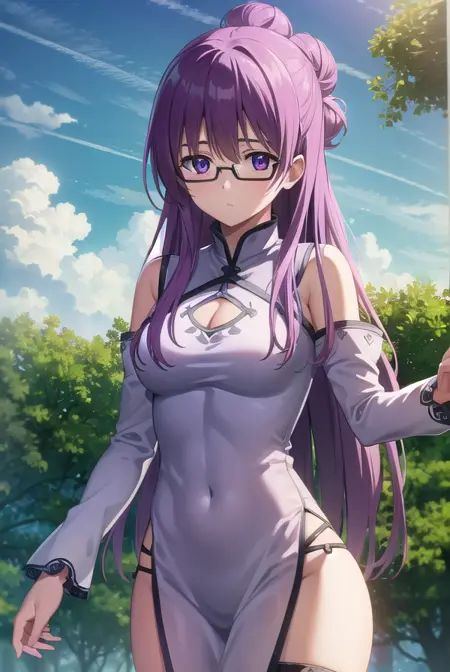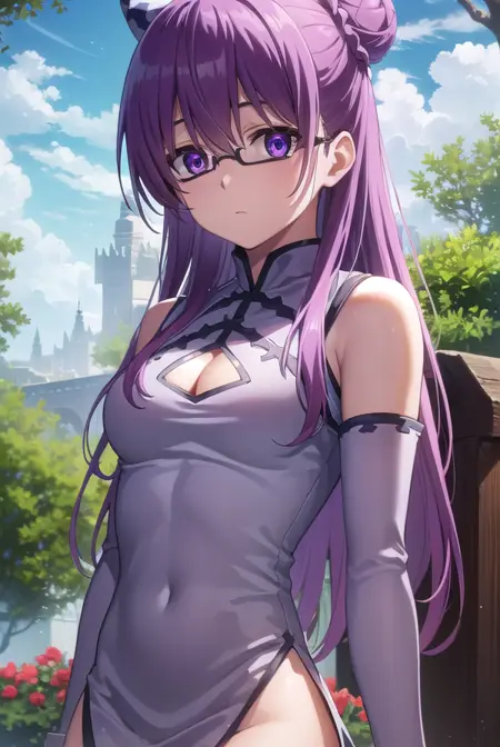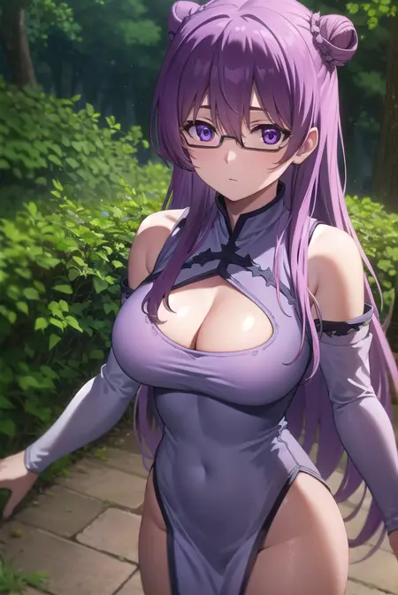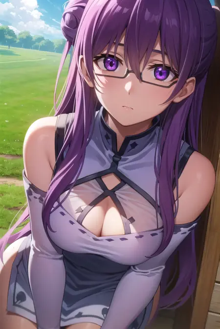sheele, 긴 머리, (보라색 눈:1.1), 보라색 머리, 안경, 머리 묶음, 단일 머리 묶음, 머리 묶음 덮개,
