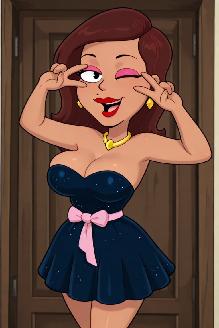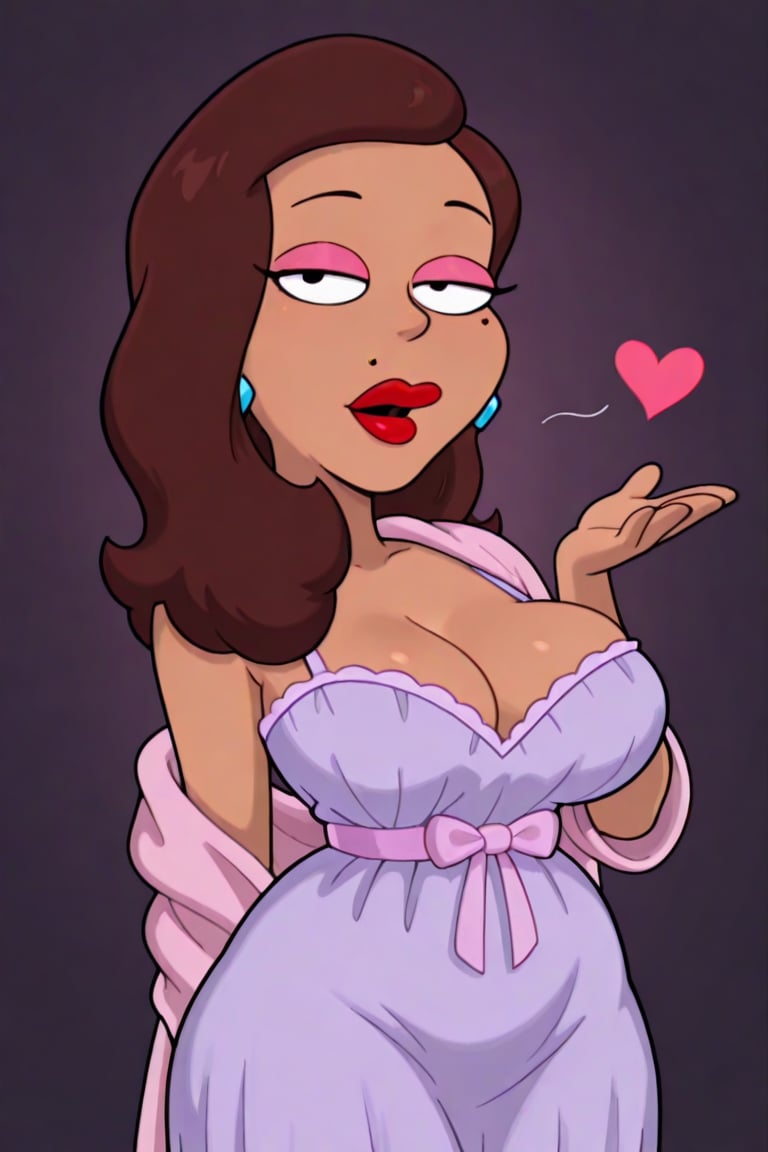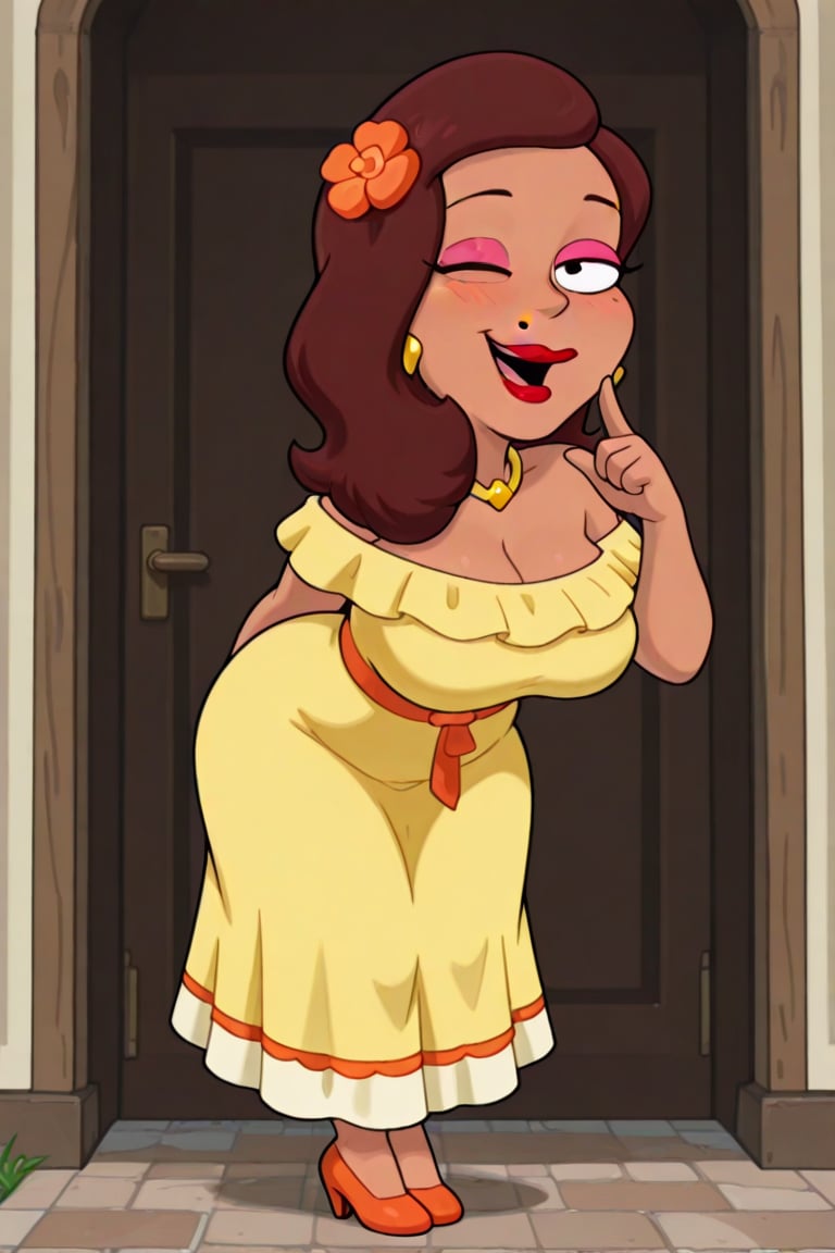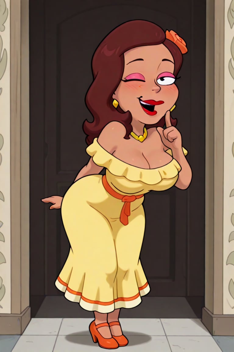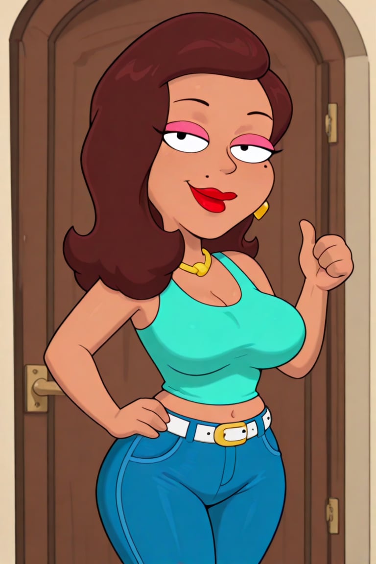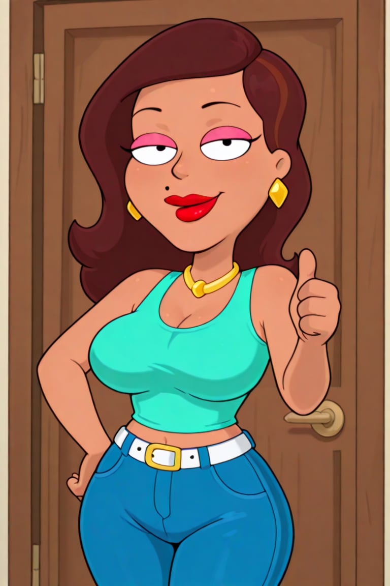茶色い肌、肩までの波状の茶色の髪、唇の上のほくろ、赤いリップ、黄色のダイヤモンドイヤリング、ゴールドのネックレス、くびれた体型、豊かなボディ、大きな胸、ピンクのアイシャドウ