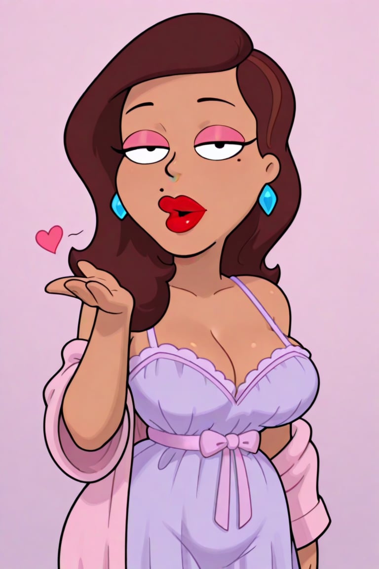 ・ナイトアウトフィット:ラベンダーの薄紫のランジェリーナイトガウン、透け感のあるピンクのローブ、ブルーのダイヤモンドイヤリング、素足