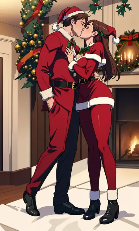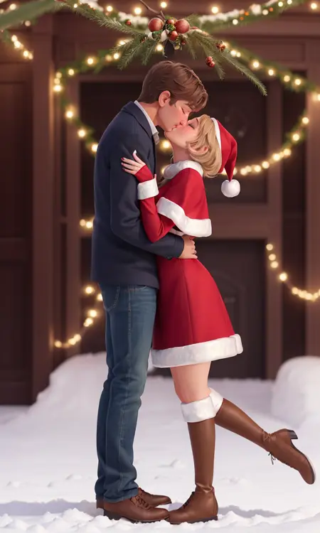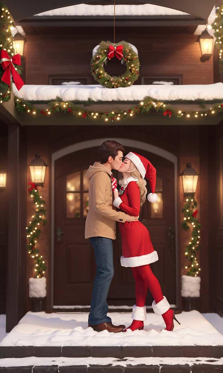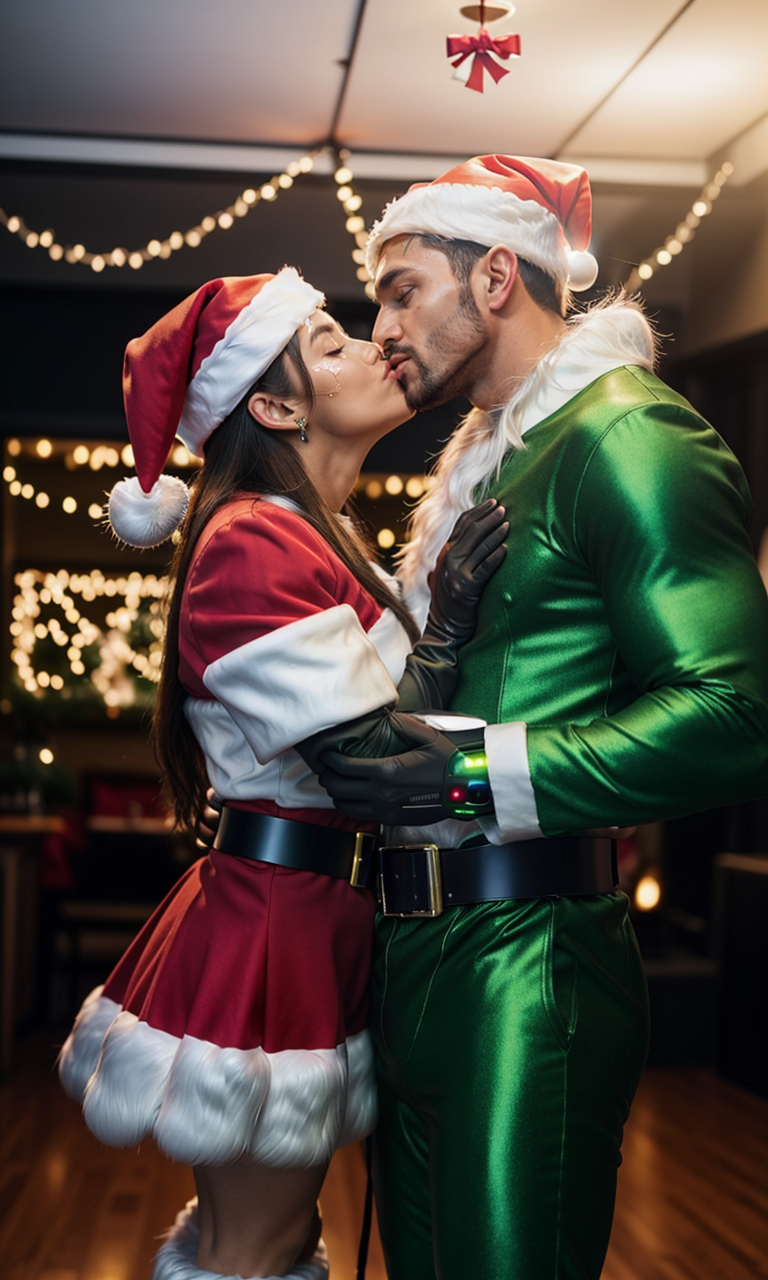 Positive prompt you should have "2 people kiss under mistletoe", and/or "mistletoe hanging from ceiling".