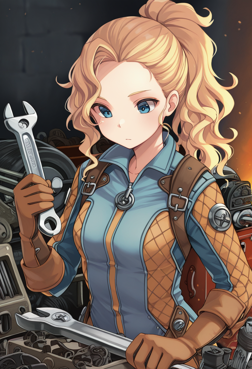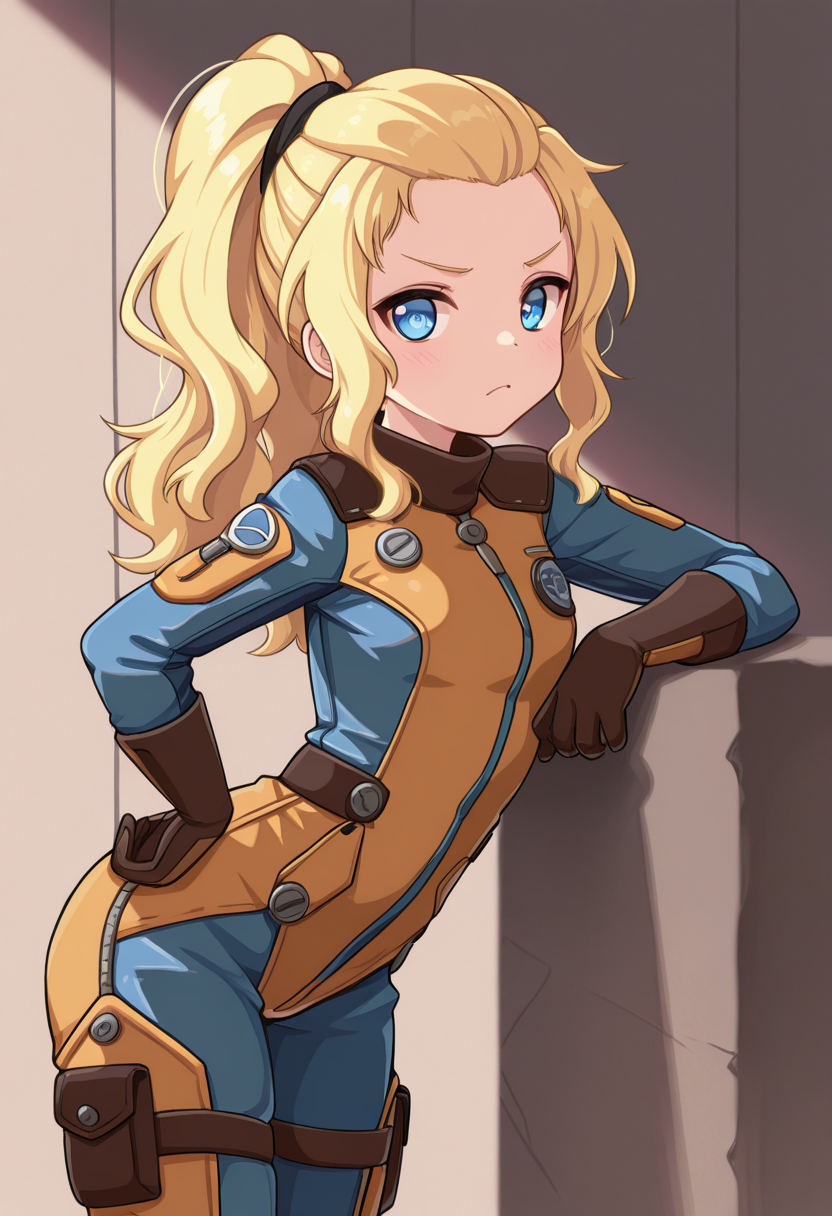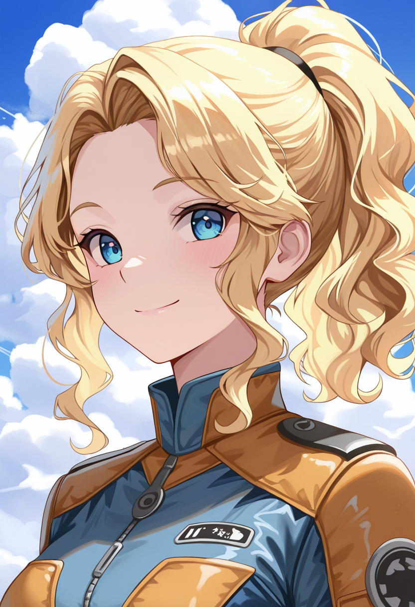 blue eyes, blonde hair, ponytail, wavy hair,