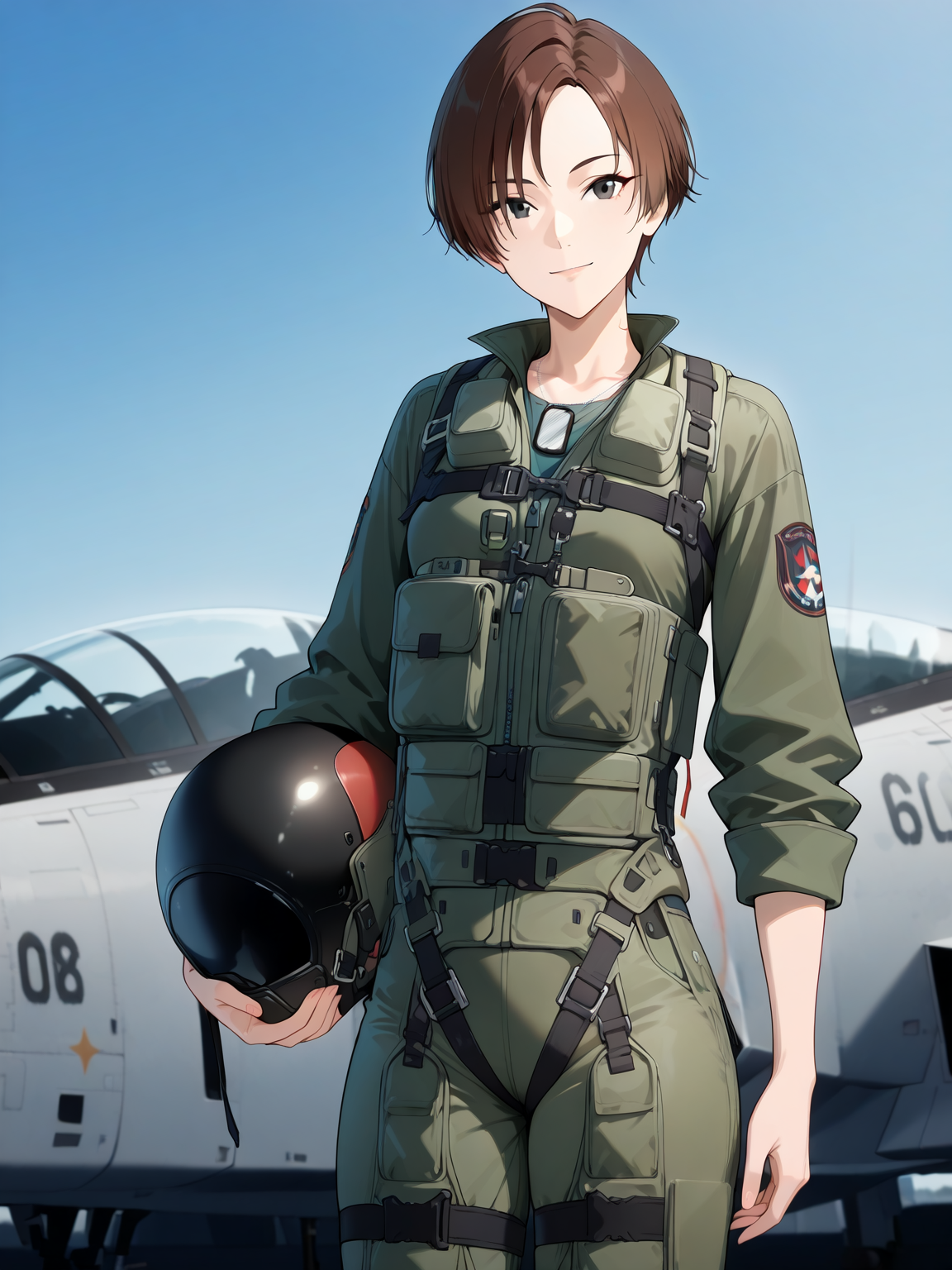 1girl, solo, kei nagase, ace combat, asian, tomboy, androgynous, anime coloring, general, airplane, aircraft, fighter jet, light smile, looking at viewer, curtained hair, short hair, brown hair, black eyes, small breasts, thick thighs, holding helmet, military, uniform, military uniform, dog tags