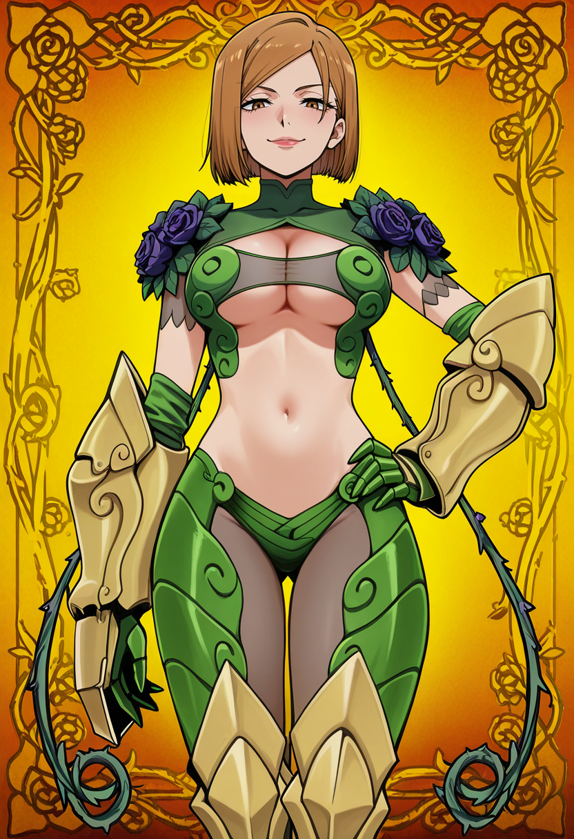 [캐릭터 이름], 유혹적인 미소, CeresCosplay, 헬멧, 눈 가린 상태, 립스틱, 붉은 입술, 식물 소녀, 식물, 배꼽 드러남, 갑옷, 갑옷 장갑, 갑옷 발톱 부츠, 덩굴, 가시, 가슴 노출, 녹색 상의, 투명한 상의, 녹색 팬티, 허벅지 부츠, 보라색 꽃, 꽃, 장미,