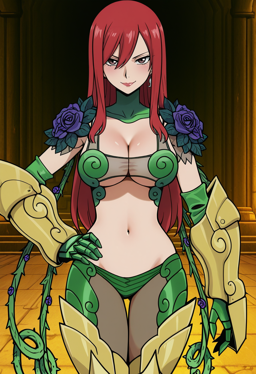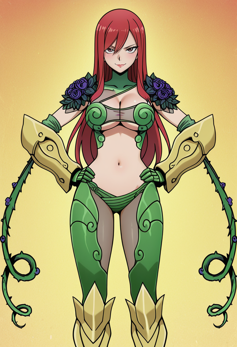 [캐릭터 이름], 유혹적인 미소, CeresCosplay, 머리 장비 없음, 립스틱, 붉은 입술, 식물 소녀, 식물, 배꼽 드러남, 갑옷, 갑옷 장갑, 갑옷 발톱 부츠, 덩굴, 가시, 가슴 노출, 녹색 상의, 투명한 상의, 녹색 팬티, 허벅지 부츠, 보라색 꽃, 꽃, 장미,