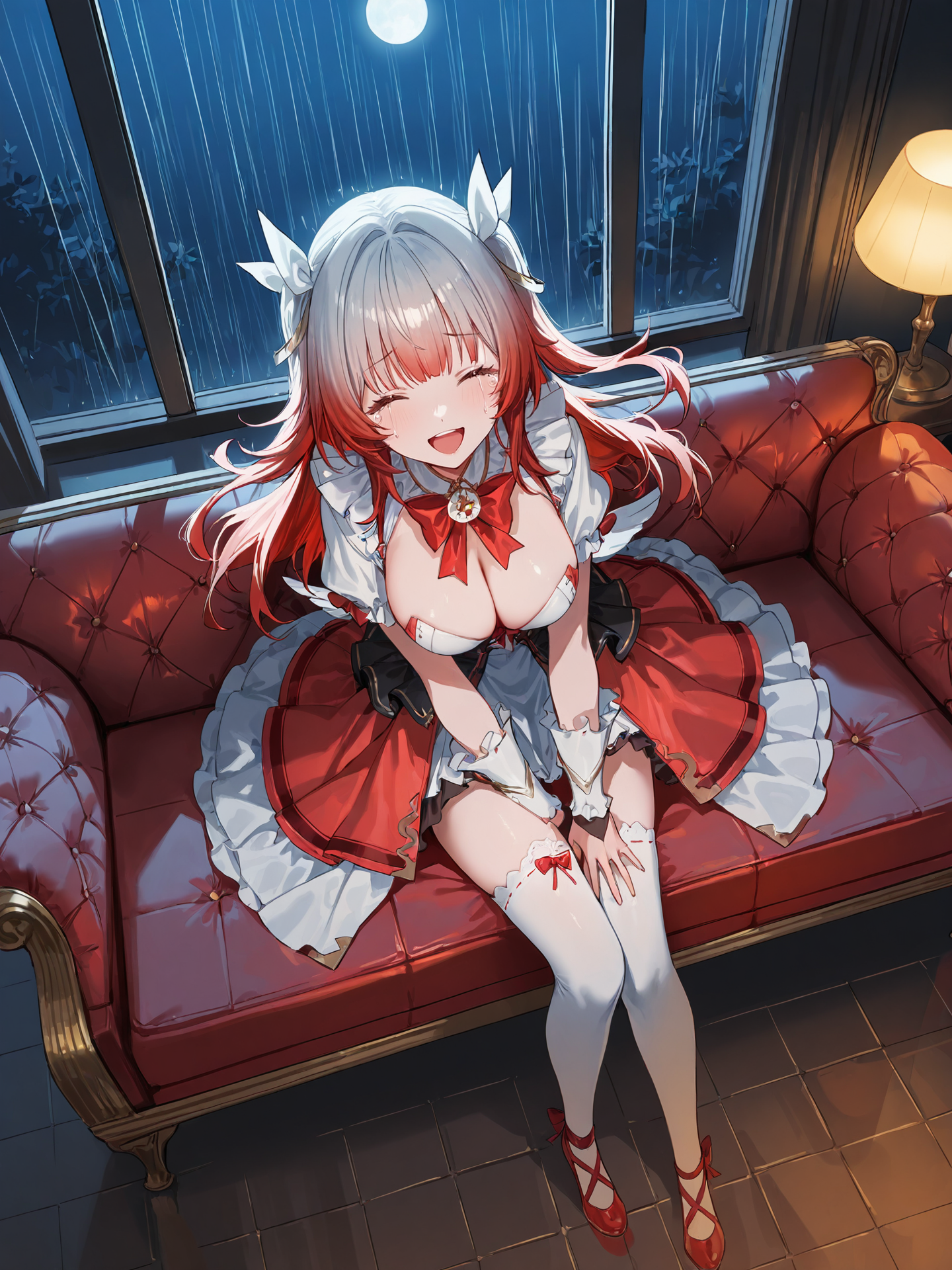提示词:PuPu, PuPu-Specular_Soul_(Heartspell Magic), white hair, red hair, multicolored hair, hair ornament, grey eyes,
