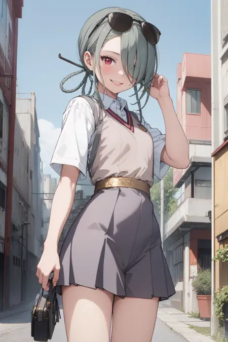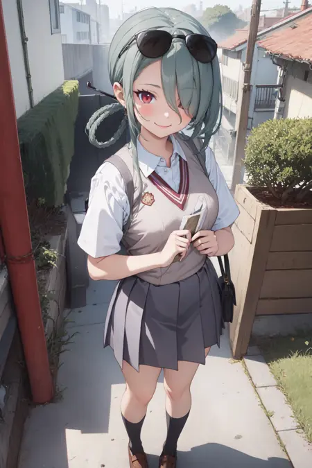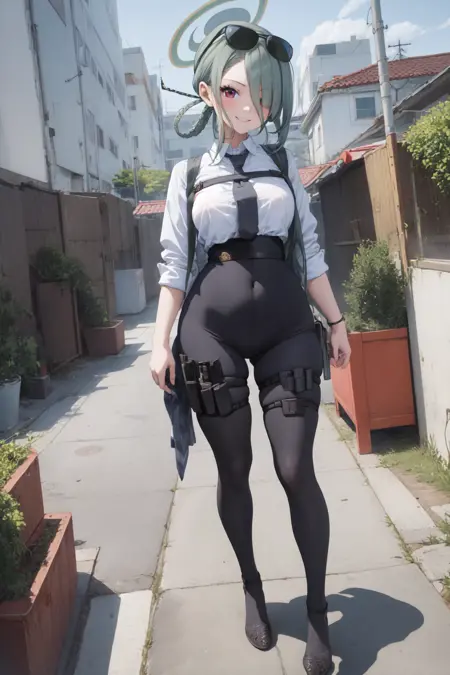 衣装:白シャツ、緑のネクタイ、肩にジャケット、黒いタイツ、ハイデザートストラップ、靴