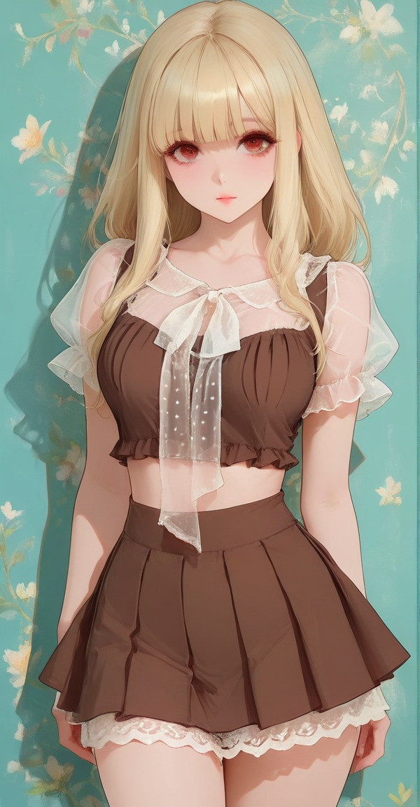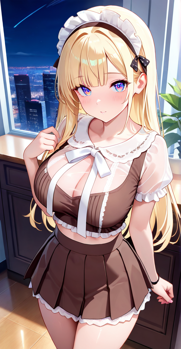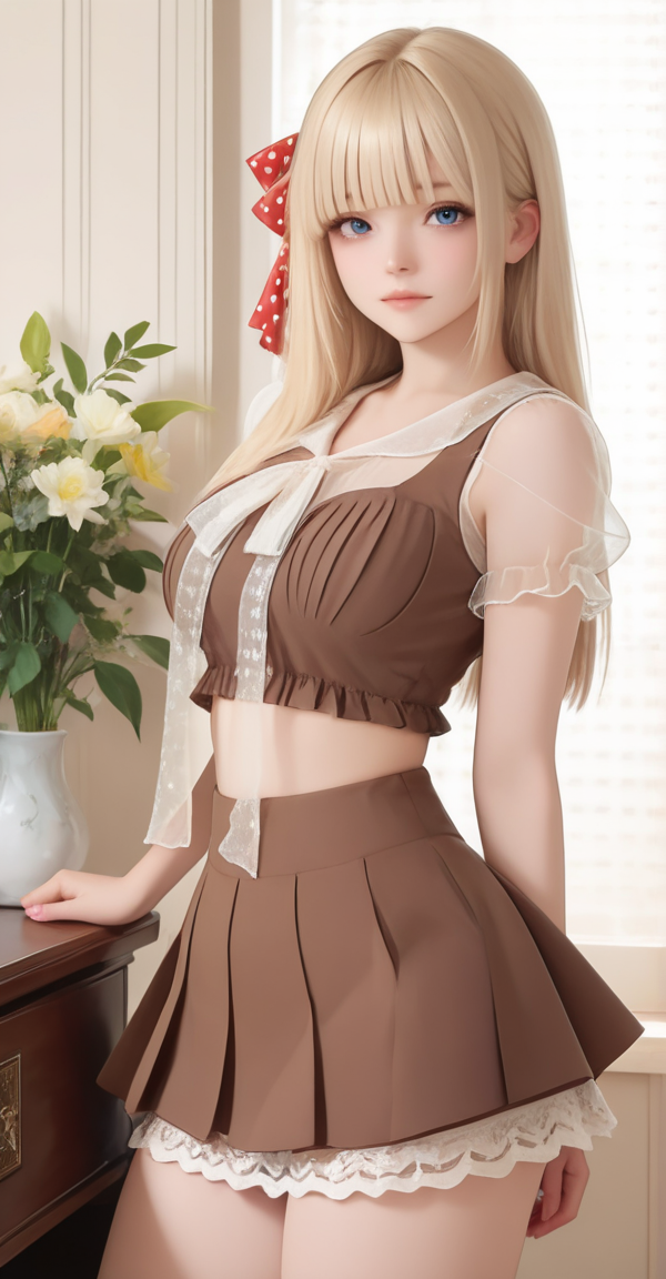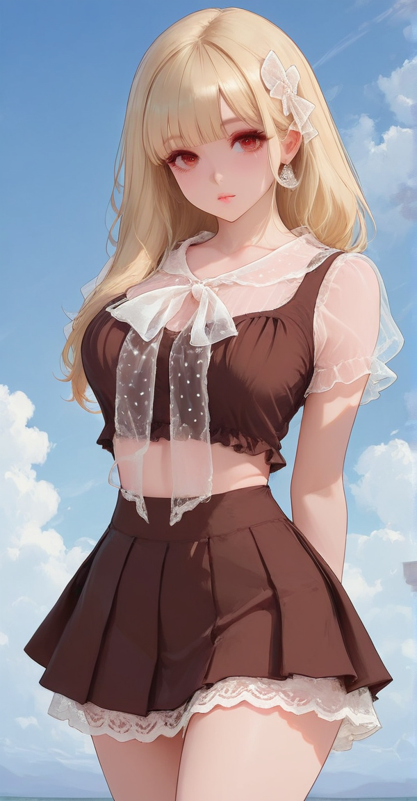 xg1, transparent white ruffled straps, ruffled organza sleeves, brown maid-style crop top, polka-dot bow, pleated mini skirt with lace-lined
