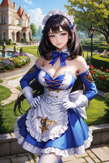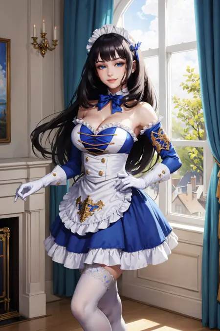 Add "maid headdress, cleavage, frilled dress, bowtie, detached sleeves, white gloves, white thighhighs" for her typical look.