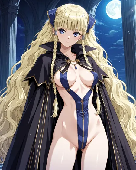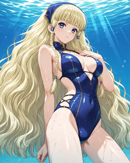 Horiguchi Yukari_sns2,1girl,solo,blue eyes,blonde hair,very long hair,wavy hair, straight bangs,Sideburns braids,