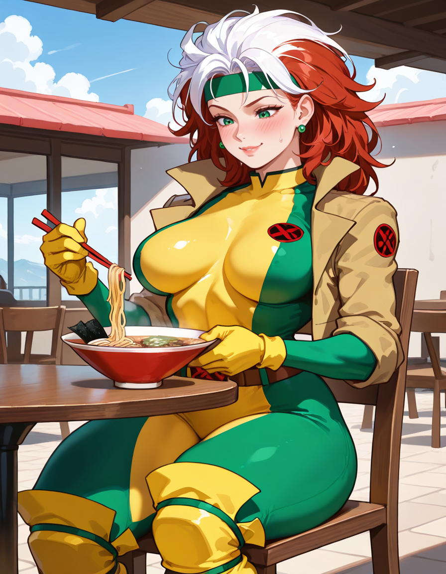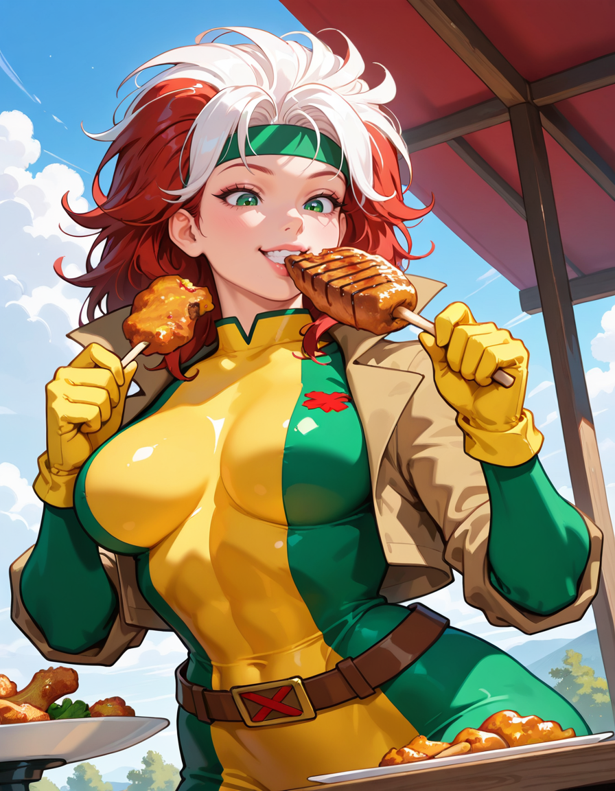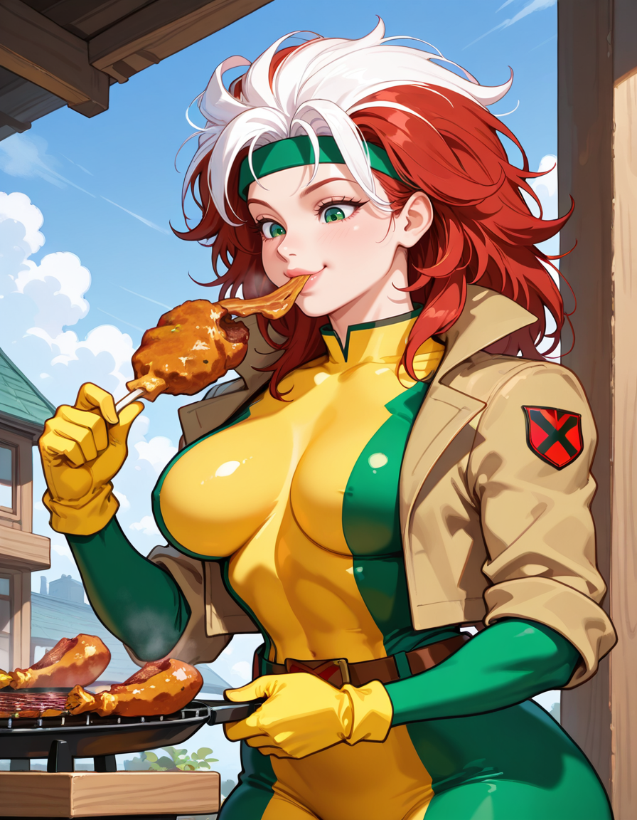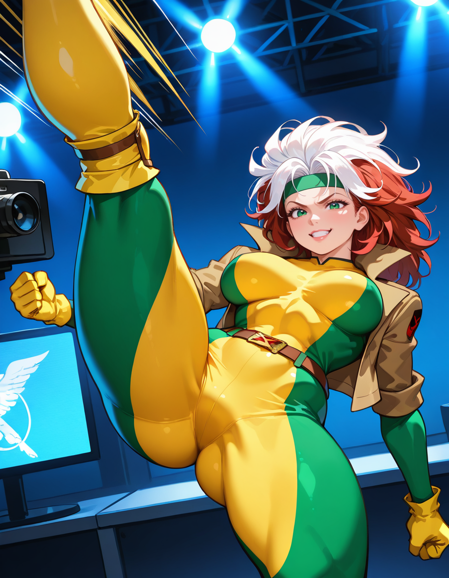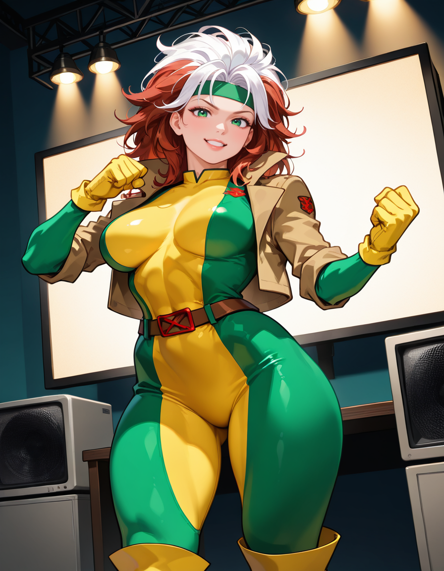 (xmen_rogue), (retro artstyle, rogue_xmen_outfit, green eyes, two-tone hair, medium hair, messy hair, curly hair, headband, lips, large breasts, breasts apart, wide hips, thick thighs, toned female), (brown cropped jacket, short sleeves, sleeves rolled u, layered sleeves, emblem on sleeves, two-tone bodysuit, yellow gloves, brown belt, yellow knee pads, yellow knee boots)