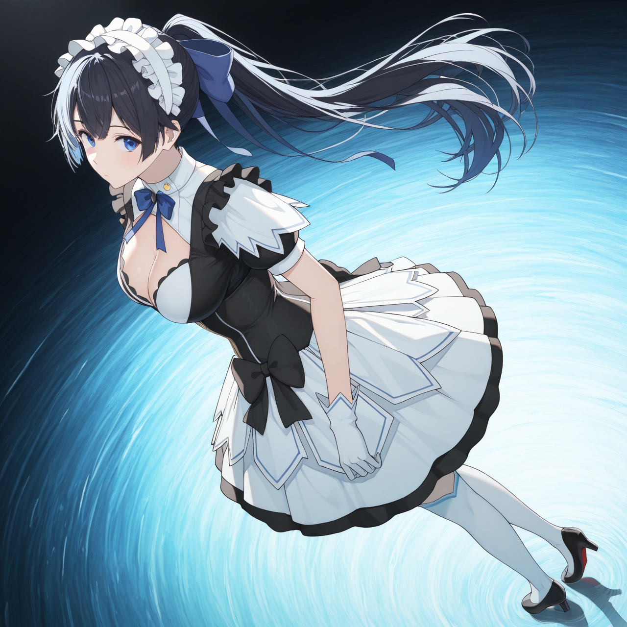 服:(青い髪飾り、長いリボン、メイド服、メイドの帽子、白いスカート、短い袖、胸元、青いネックリボン、コルセット、白い手袋、白いタイツ、黒いハイヒール)