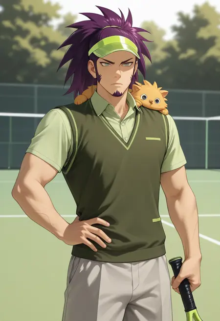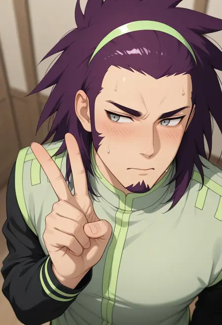 tetsu_purple hair, tetsu_grey eyes, 1boy, medium hair, spiked hair, long sideburns, goatee, green hairband,