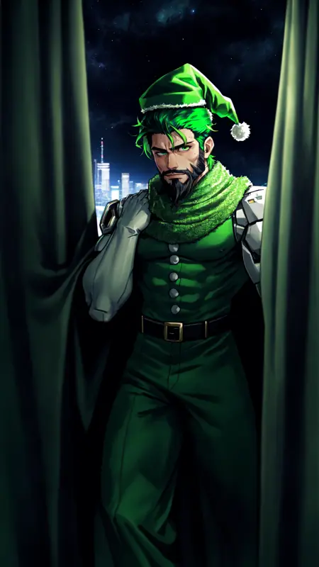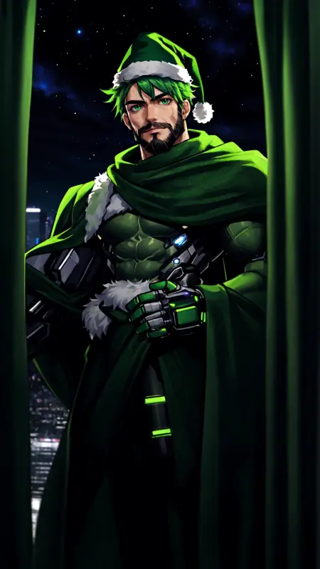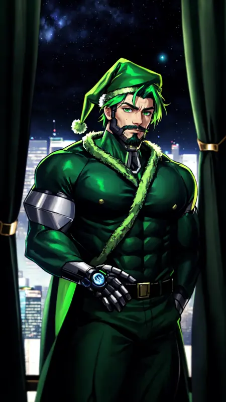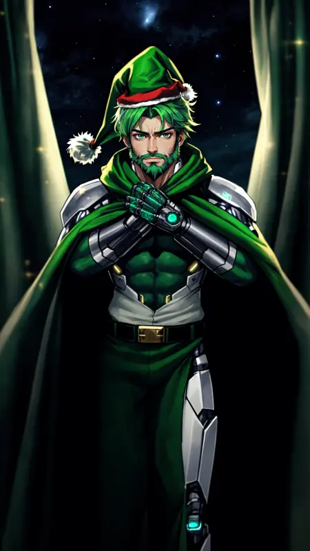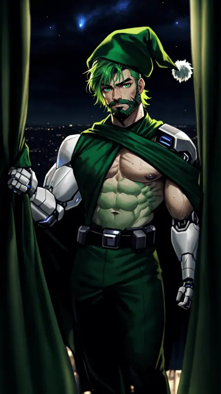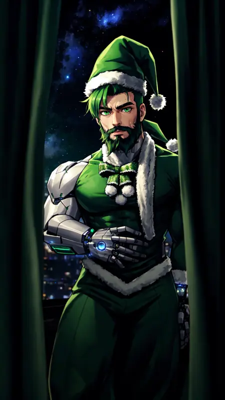 青をテーマにしたサンタ帽をかぶったサイボーグ男性に影響を与える。