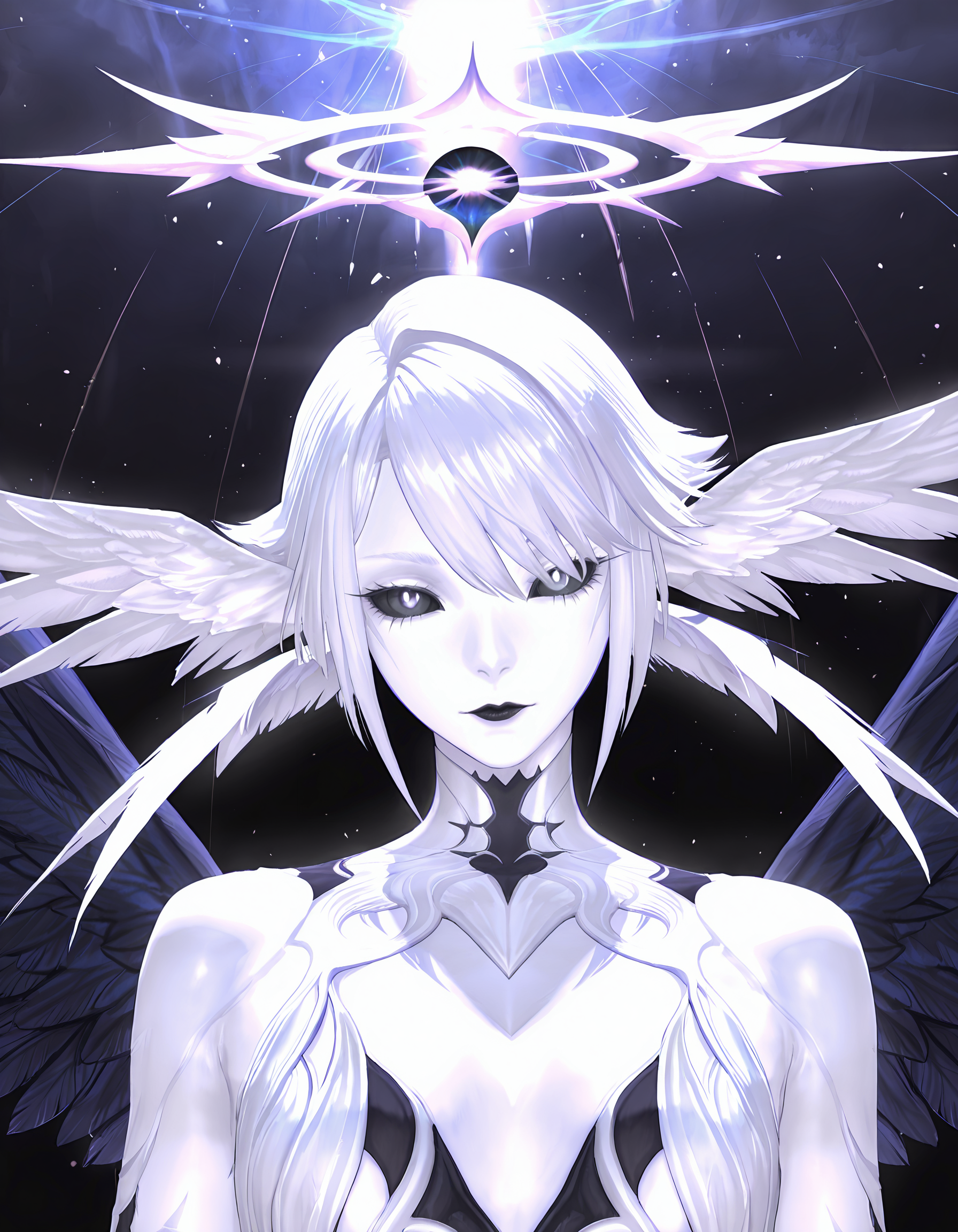 lora:athenaGod\_FF14\_Illustrious:1, athenaGodFF14, 白い瞳, 黒い白目, 白髪, 短髪, モンスター娘, 頭に翼, 翼,