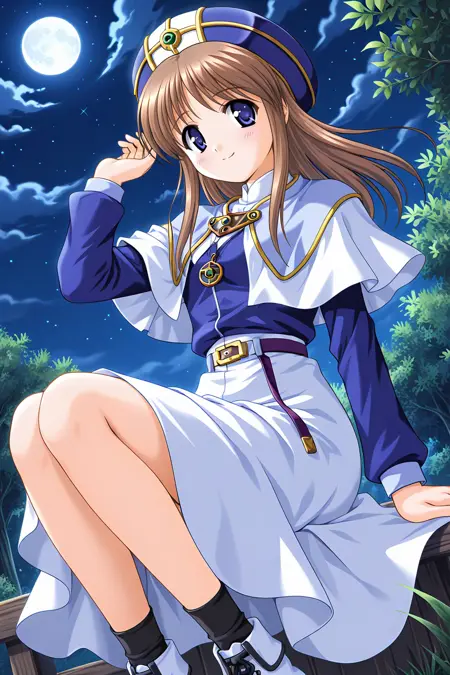 hat,blue headwear,priest,robe,gem,brooch,pendant,white capelet,light purple capelet,layered capelet,turtleneck,blue dress,long sleeves,belt,white skirt,long skirt,legs,kneehighs,black socks,ankle boots,white footwear,