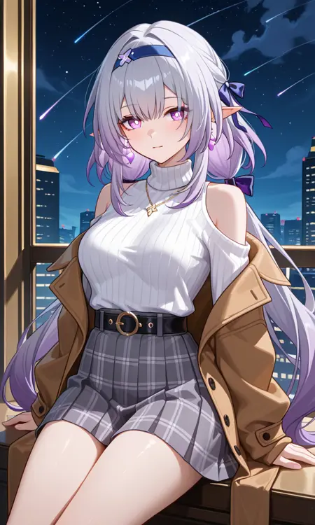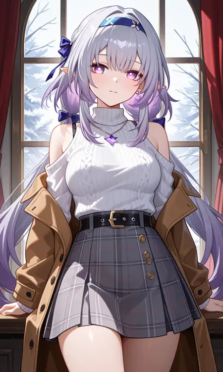 Castorice (Honkai: Star Rail), long hair, light purple hair, grey hair, gradient hair, hair purple eyes, bright pupils, pointy ears, earrings, bangs, low twintails, very long twintails, very long low twintails, medium breasts, thighs, alternate costume, skirt, shoulder cutout, sweater, belt, hairband, coat, bow, black belt, hair bow, clothing cutout, open coat, jewelry, long sleeves, earrings, plaid skirt, blue hairband, plaid, turtleneck, open clothes, brown coat, off shoulder, grey skirt, bare shoulders
