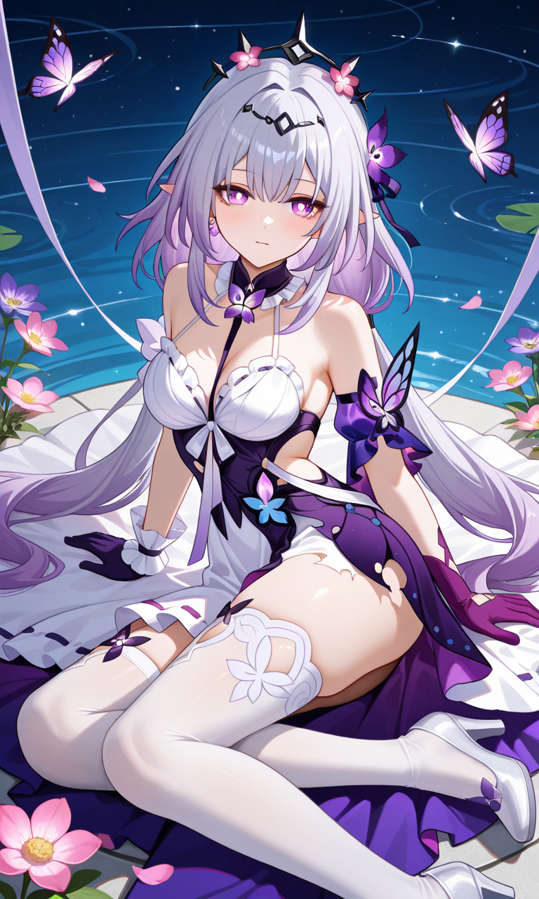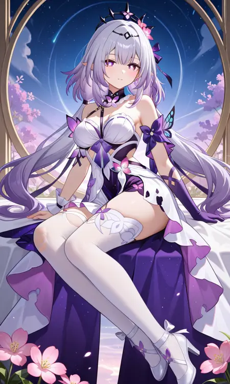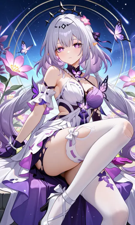 Castorice (Honkai: Star Rail), very long hair, light purple hair, grey hair, gradient hair, hair flowers, pink flower, purple flower, hair ornament, black tiara, purple eyes, bright pupils, pointy ears, earrings, bangs, low twintails, very long twintails, very long low twintails, medium breasts, thighs, frilled collar, strap between breasts, torn dress, two-tone dress, white dress, purple dress, ribbon-trimmed dress, clothing cutout, bandages, purple ribbon, white ribbon, frilled cuff, butterfly ornament, flower, uneven gloves, purple gloves, single elbow gloves, armband, white thighhighs, thigh cutout, hip vent, white footwear, high heels, bare shoulders