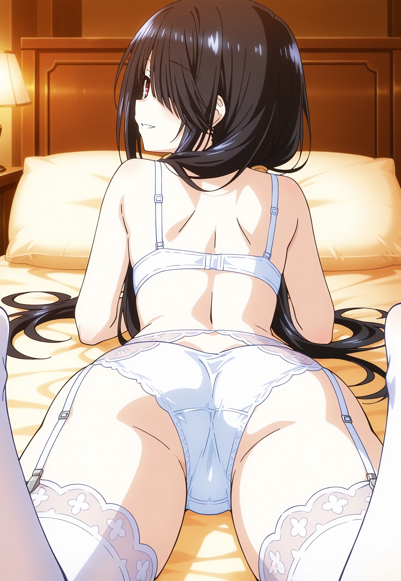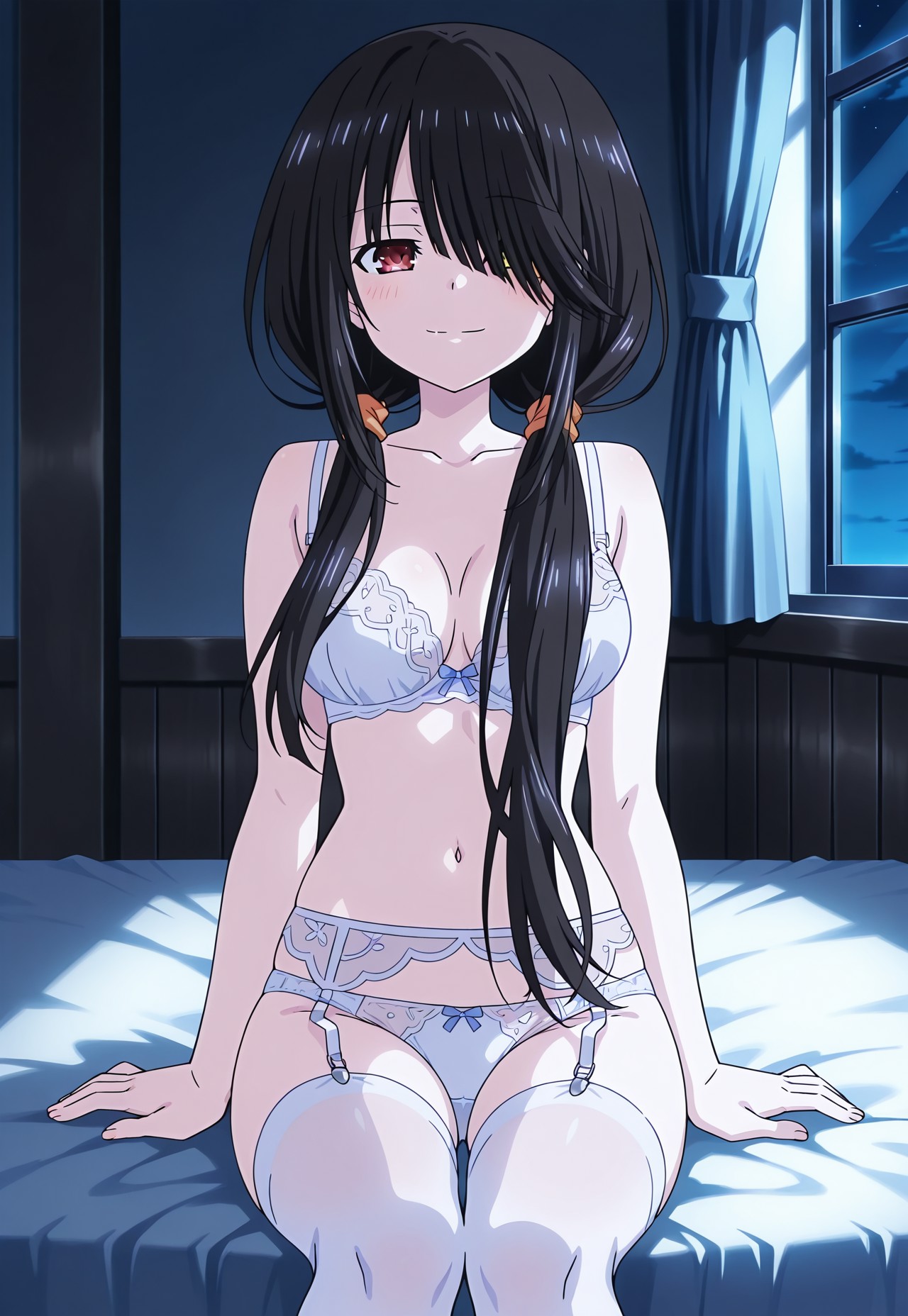 anime screencap, 1girl, tokisaki kurumi, solo, black hair, low twintails, long side locks, hair over shoulder, red eye, (hair over one eye:1.3), bangs covering left eye, sly smile, seductive expression, (white bra:1.3), (white panties:1.2), (garter straps:1.4), white stockings, bare midriff, atmospheric lighting