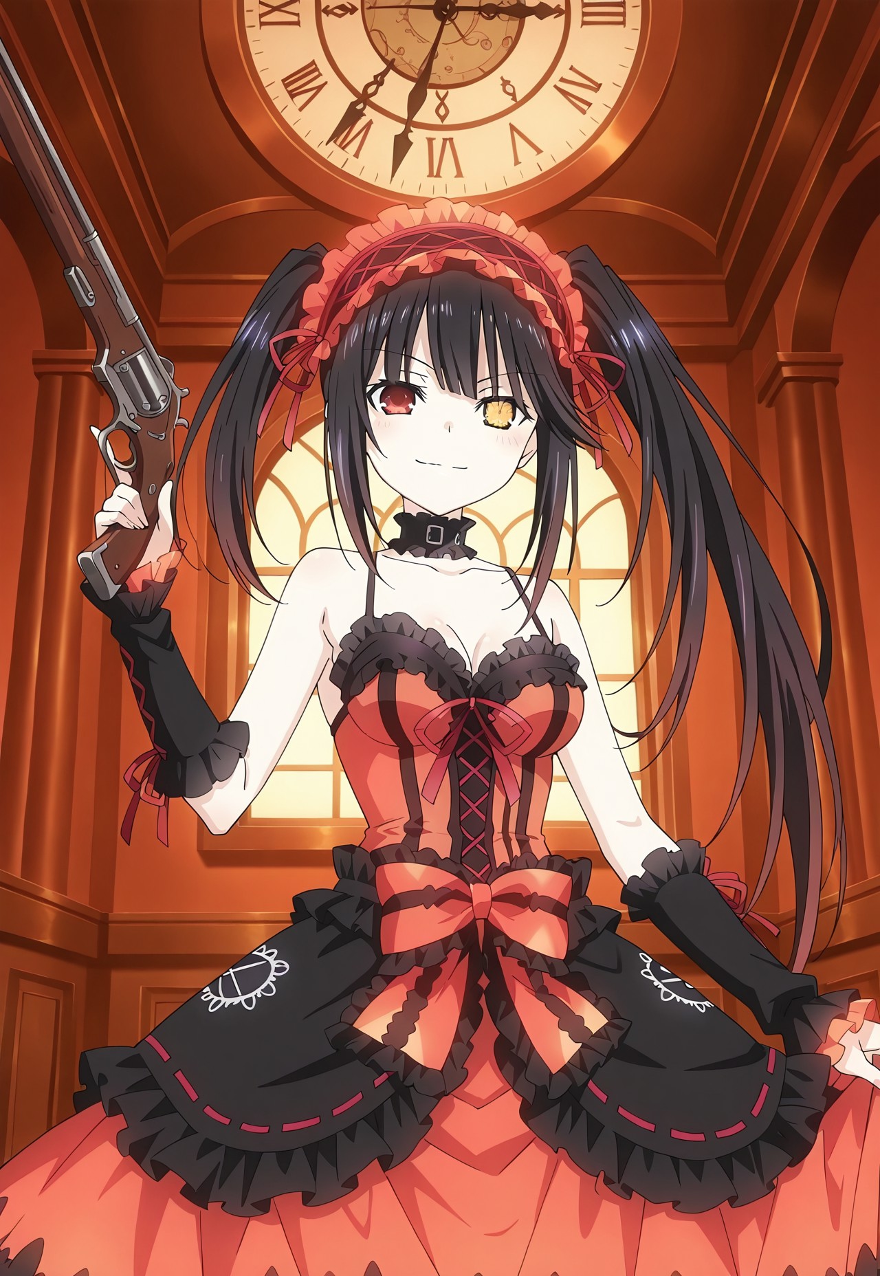 Masterpiece, best quality, official art, source_anime, Date a live, <lora:Tokisaki-kurumiV1:0.9>, 1girl, tokisaki kurumi, solo, astral dress, gothic dress, red and black dress, frills, bow, ribbon, multilayered dress, choker, wrist cuffs, heterochromia, unequal eyes, red eye, yellow eye, clock on eye, symbol in eye, black hair, twintails, long hair, bangs, hair ribbon, looking at viewer, smile, seductive smile, tsundere expression, slightly puffy cheek