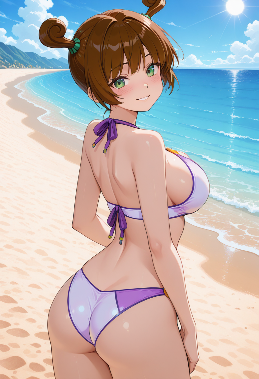 JuneSwim, 1girl, solo, short hair, twintails, brown hair, green eyes, large breasts, curvy, wide hips, swimsuit, navel, bikini, criss-cross halter, cleavage, halterneck, multi colored bikini, purple bikini, white bikini, thighs, barefoot,