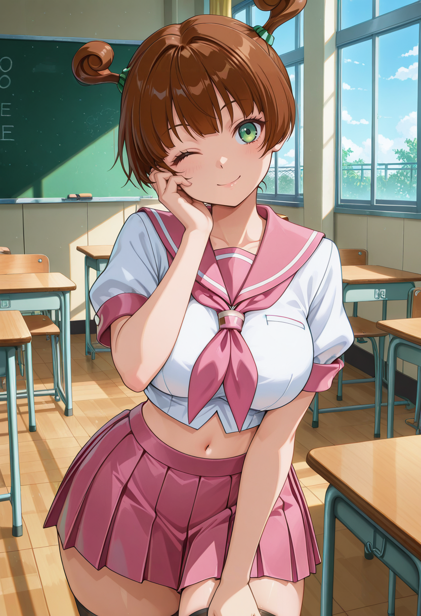 JuneSchool, 1girl, solo, short hair, twintails, brown hair, green eyes, large breasts, curvy, wide hips, school uniform, serafuku, crop top, sailor collar, pink neckerchief, short sleeves, white shirt, midriff, navel, pleated skirt, pink skirt, black thighhighs, loafers,