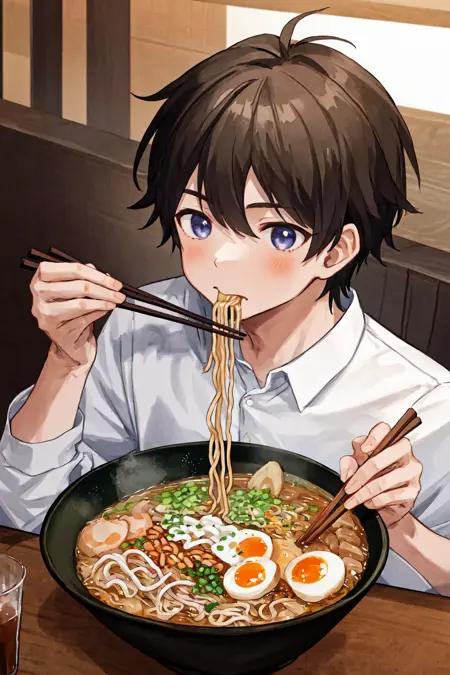 ラーメンを手づかみではなく、箸を使って正しく食べるようになります。