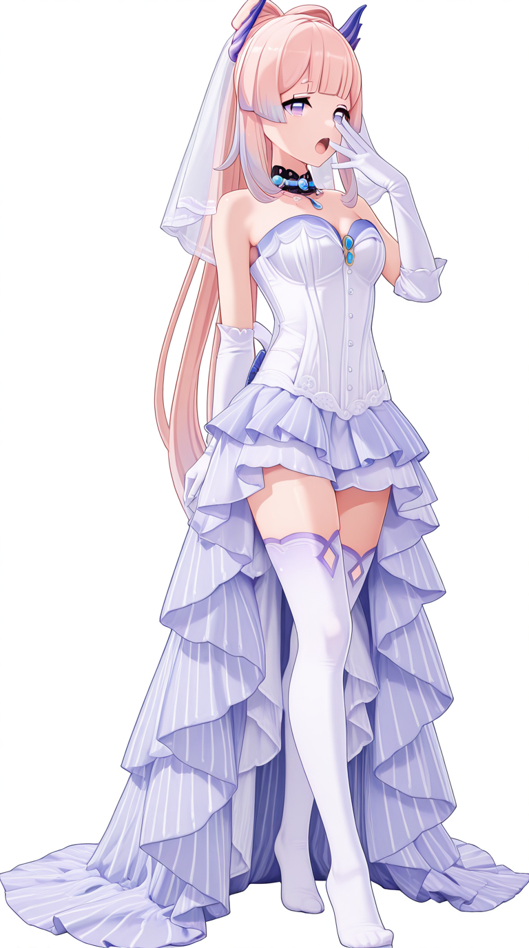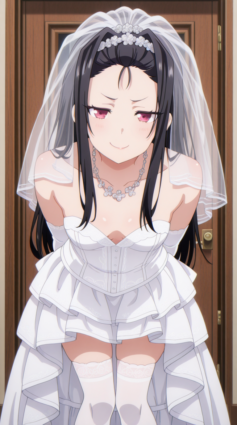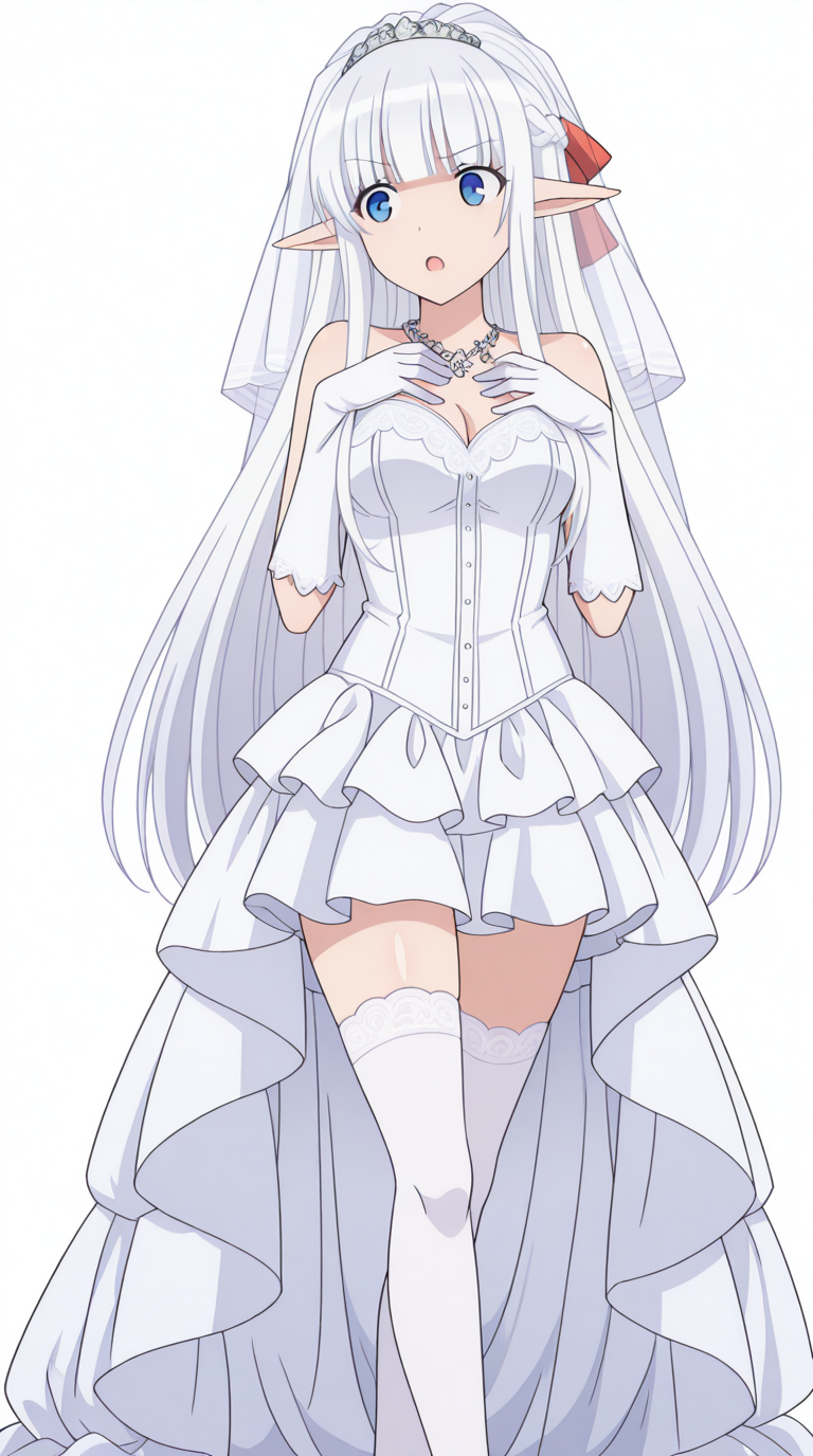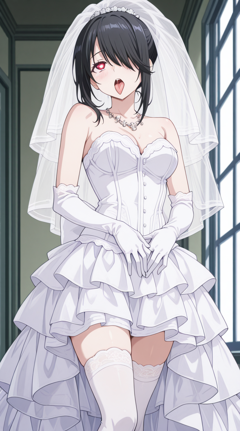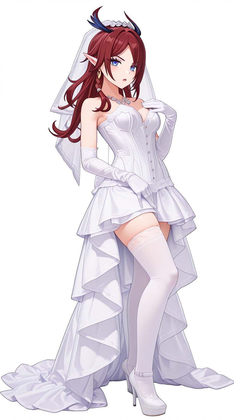 lora:high-low-wedding-dress-illustriousxl-lora-nochekaiser:1, high-lowweddingdress, gloves, dress, thighhighs, jewelry, bare shoulders, elbow gloves, necklace, white thighhighs, veil, wedding dress, bridal veil, bride